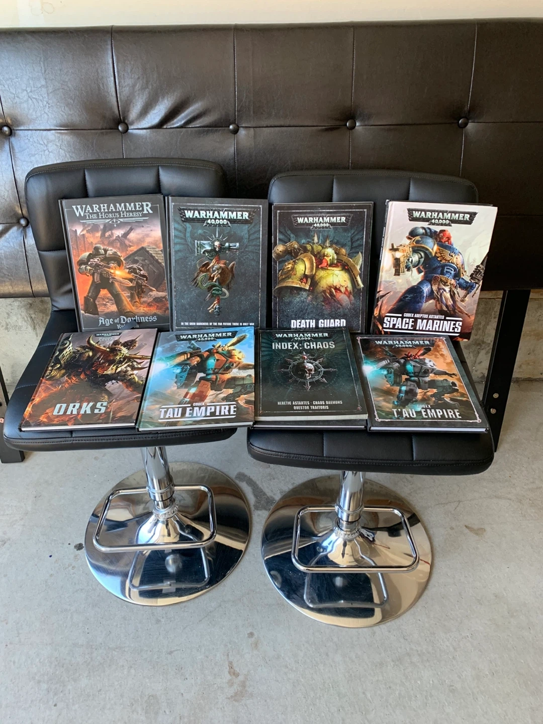 Collection of Warhammer 40,000 books including Age of Darkness, Death Guard, Index: Chaos, Space Marines, Orks, and Tau Empire. These books are for the popular tabletop game