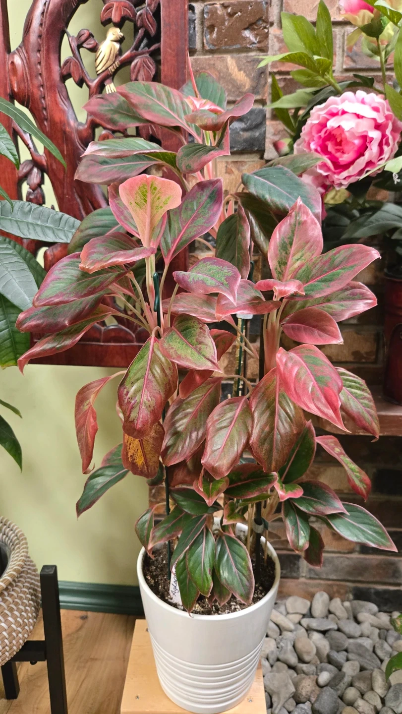 This is a lovely Aglaonema Pink Valentine plant. It has vibrant pink and green variegated leaves. Comes potted in a white ceramic planter.