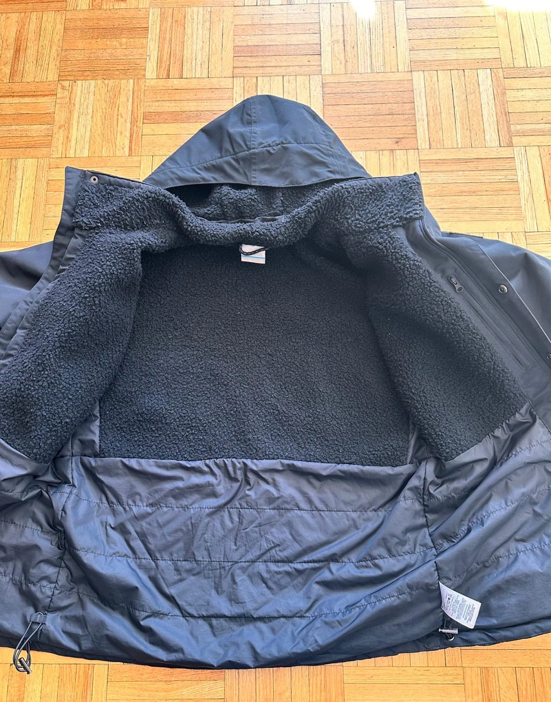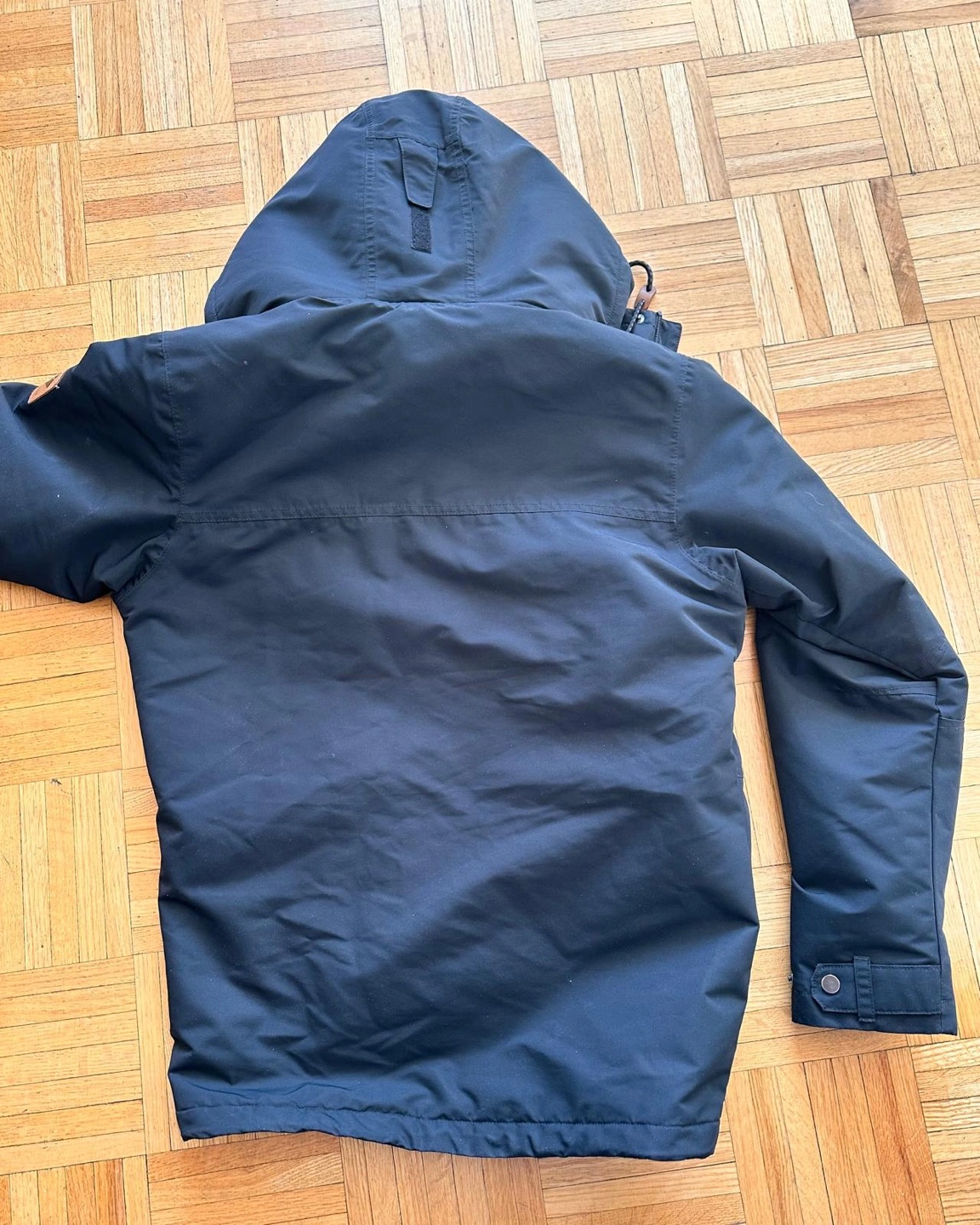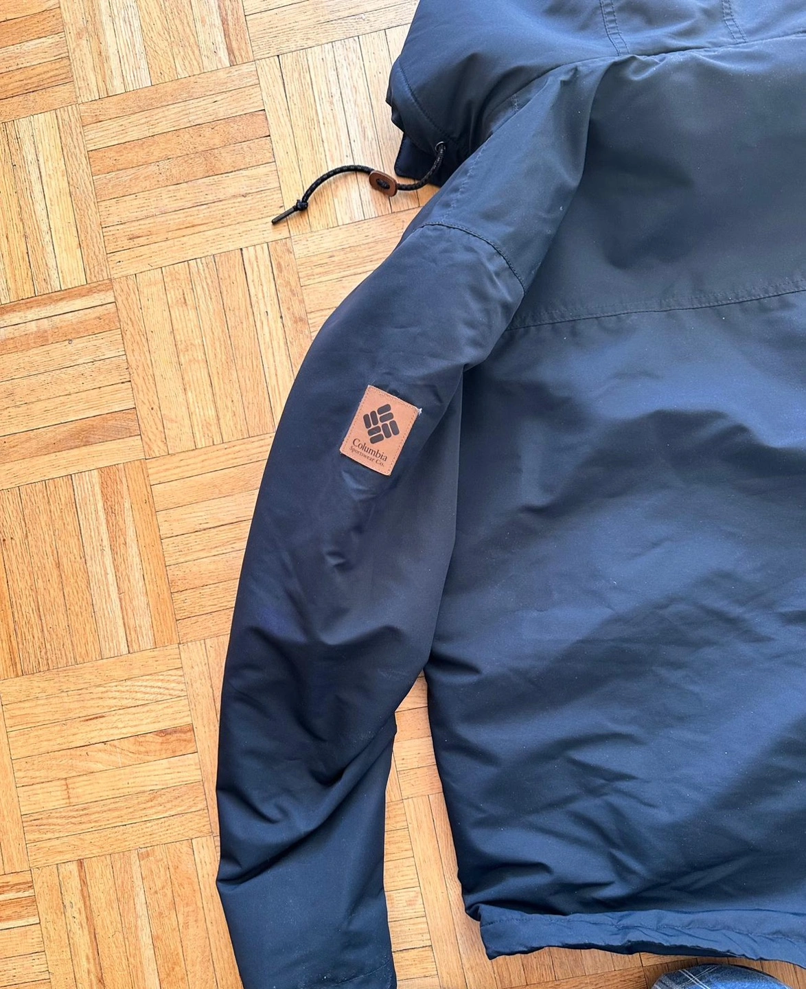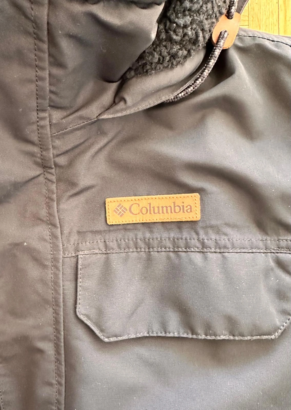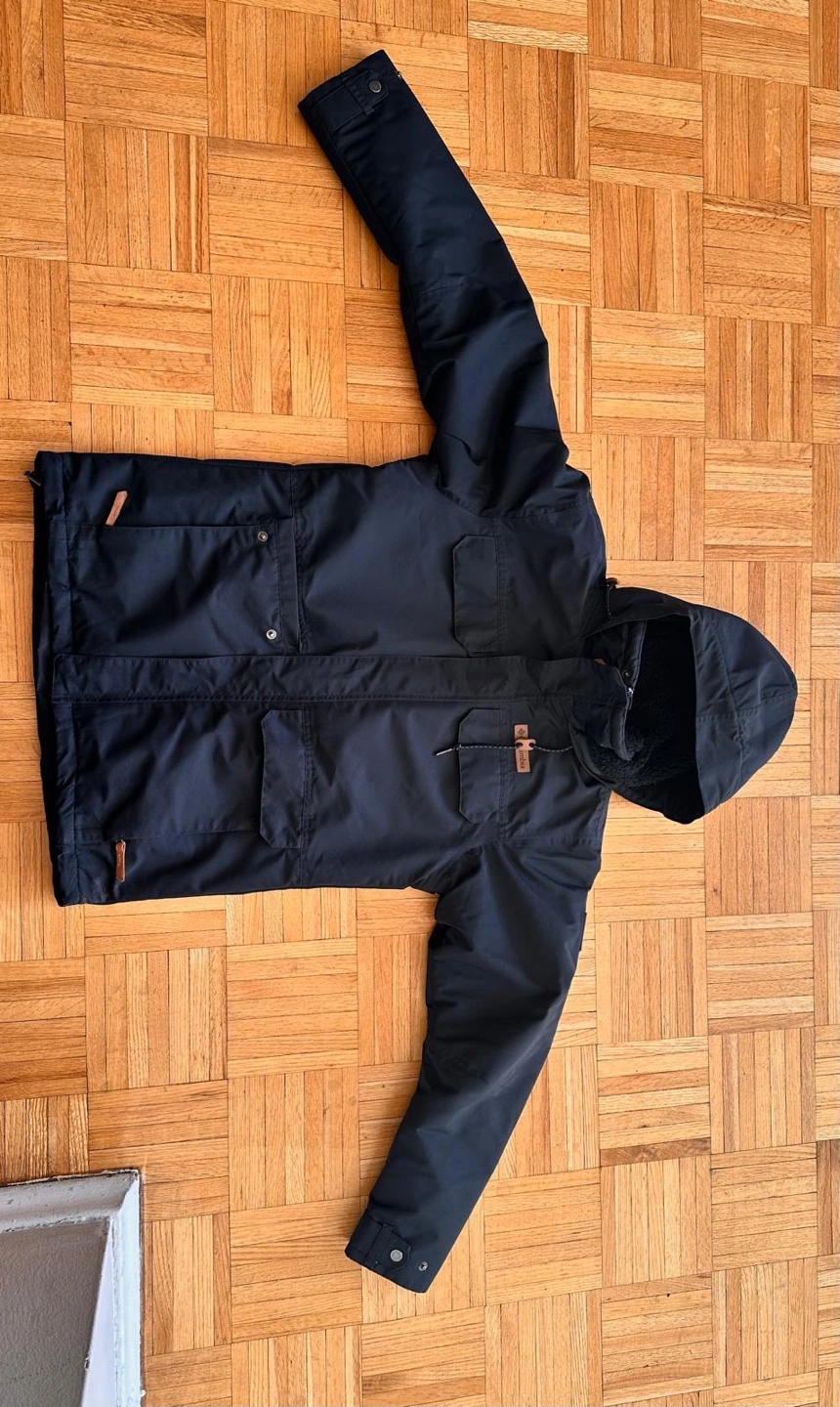 Men's Columbia winter jacket. Size small. Black colour. Features a hood, multiple pockets, and a fleece lining. Warm and comfortable for cold weather.
