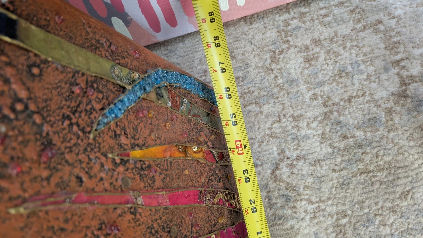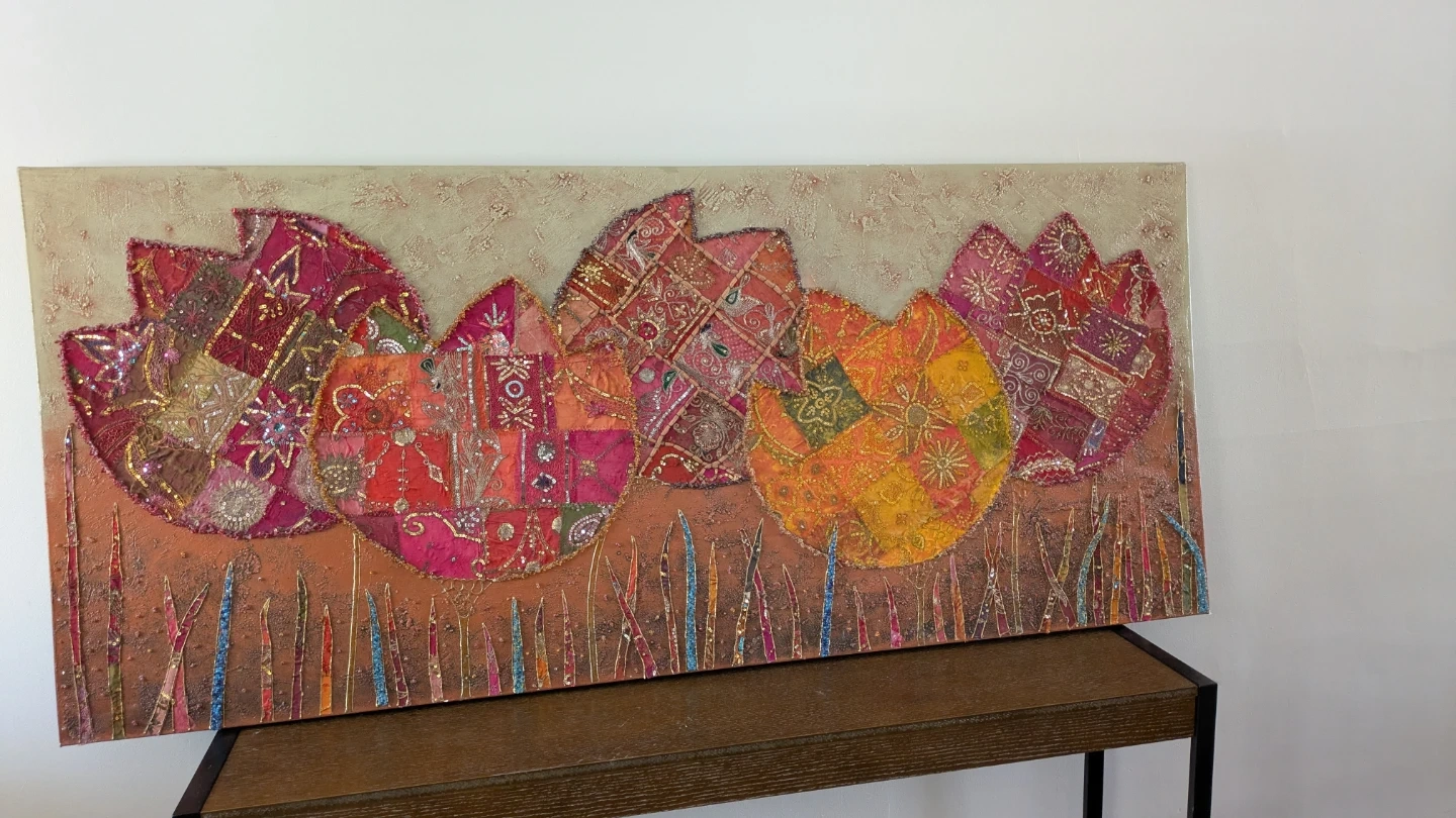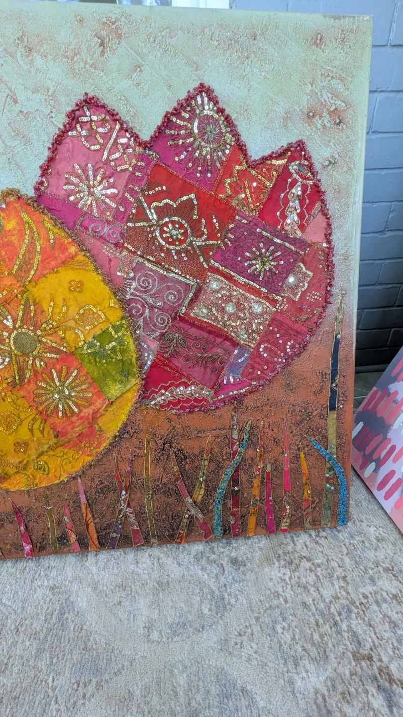 Textured fabric wall art featuring a vibrant floral design. It's approximately 30 x 60 inches. This unique piece adds a pop of colour and texture to any room!