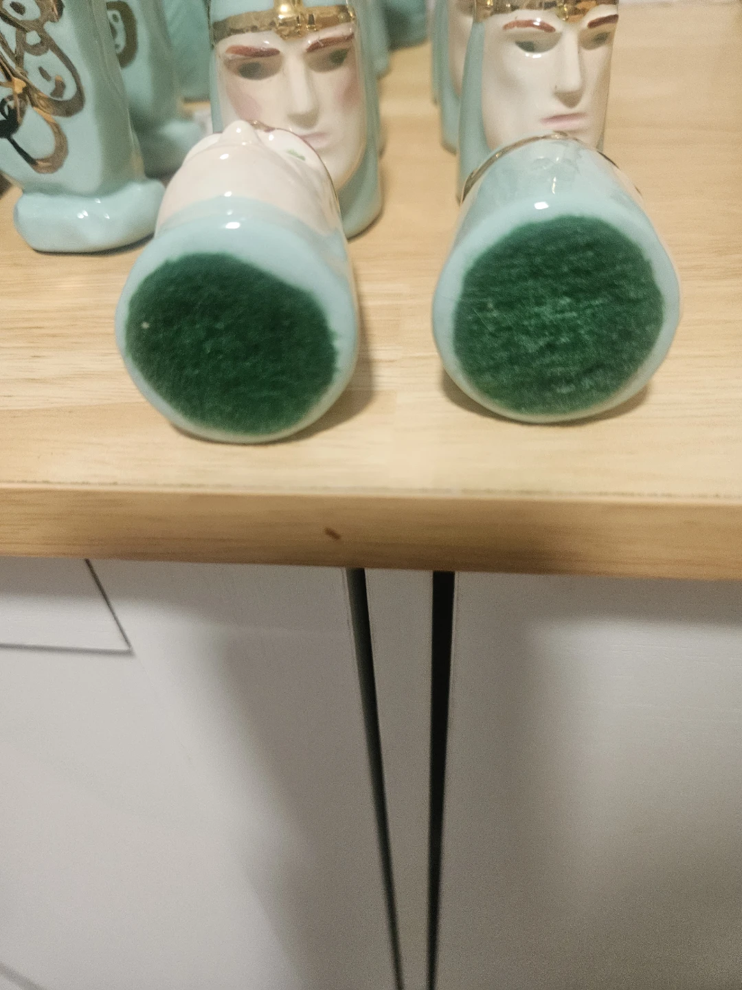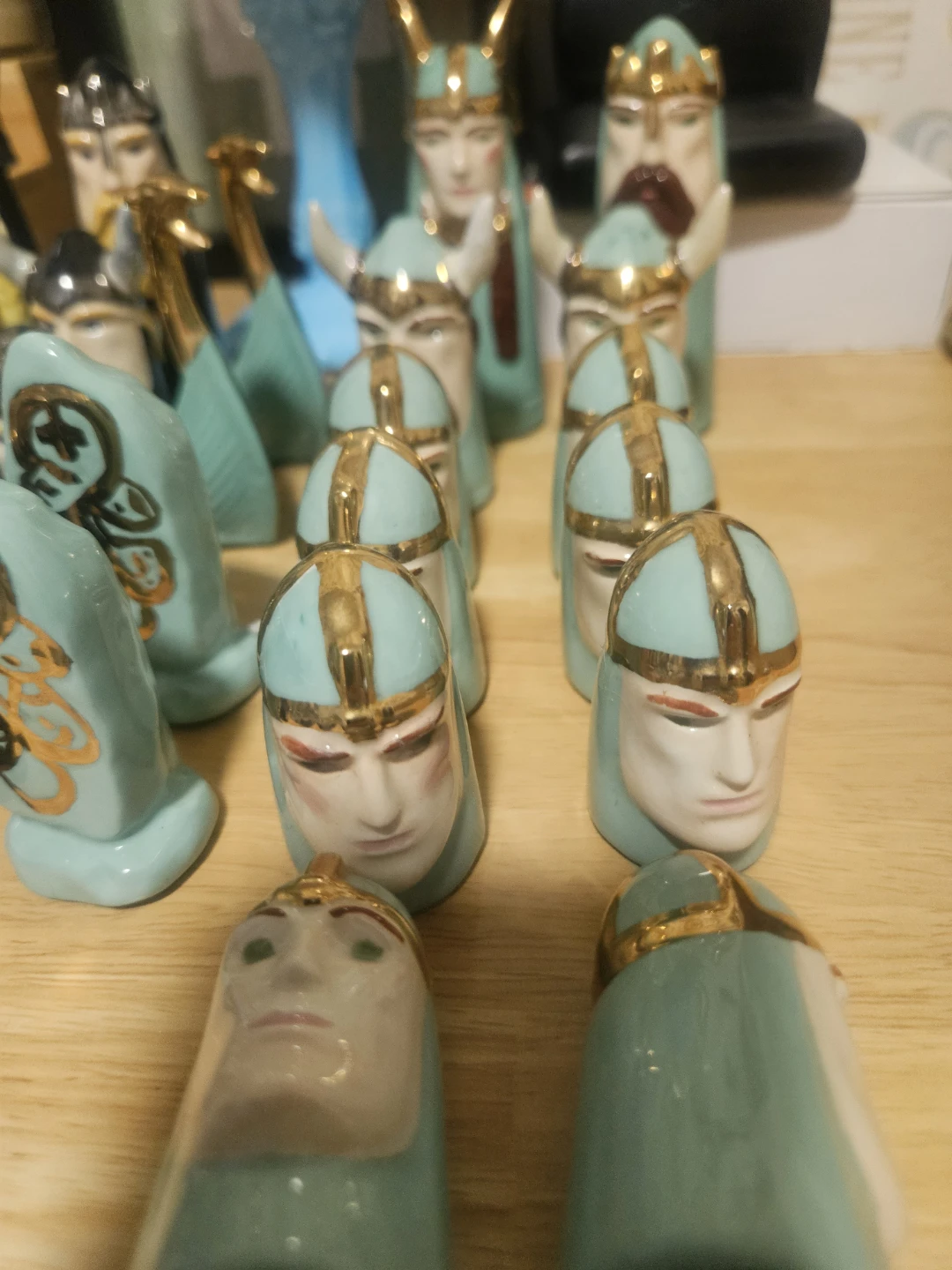 Complete set of unique ceramic chess pieces featuring Viking-inspired designs. Each piece is hand-painted with intricate details and a gold accent finish. Includes felted bases for smooth movement on the board.Made byDuncan Mold