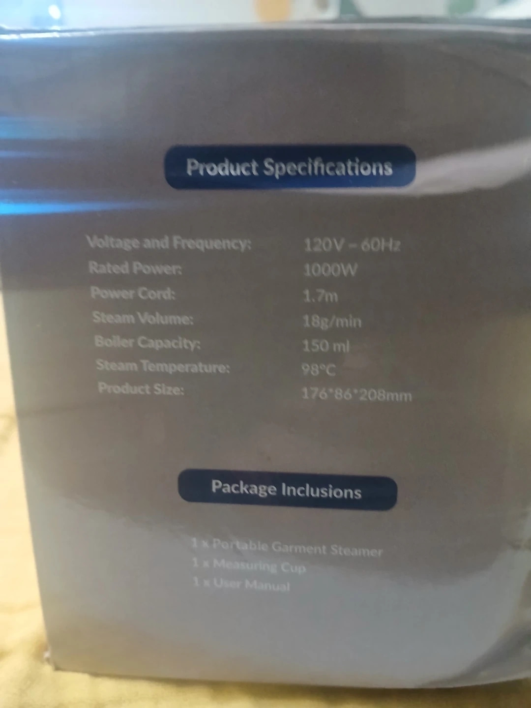 This portable garment steamer effectively removes wrinkles from clothes, drapes, and other fabrics. It comes with a 150 ml boiler capacity and a steam volume of 18g/min. Includes a portable garment steamer, measuring cup, and user manual.
