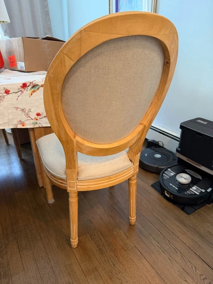 Upholstered dining chairs with beige tweed fabric and natural wood legs. Seat dimensions are 18" deep x 19.5" wide x 19.25" high. Each chair holds up to 250 lbs. Originally retailed for $250 each. Selling all 4 for $450 or best offer.