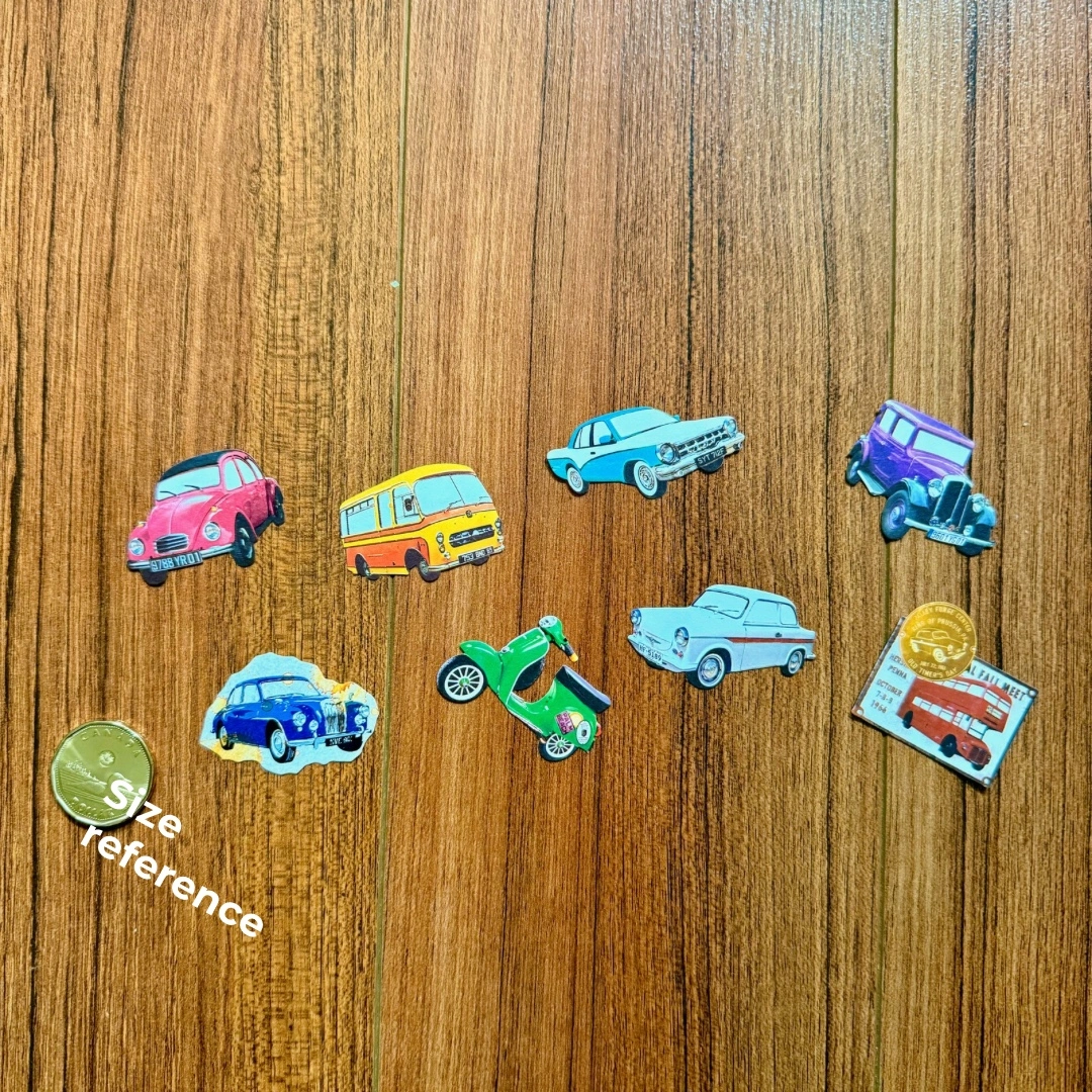 A set of vintage car stickers. Includes 5-7stickers per design.