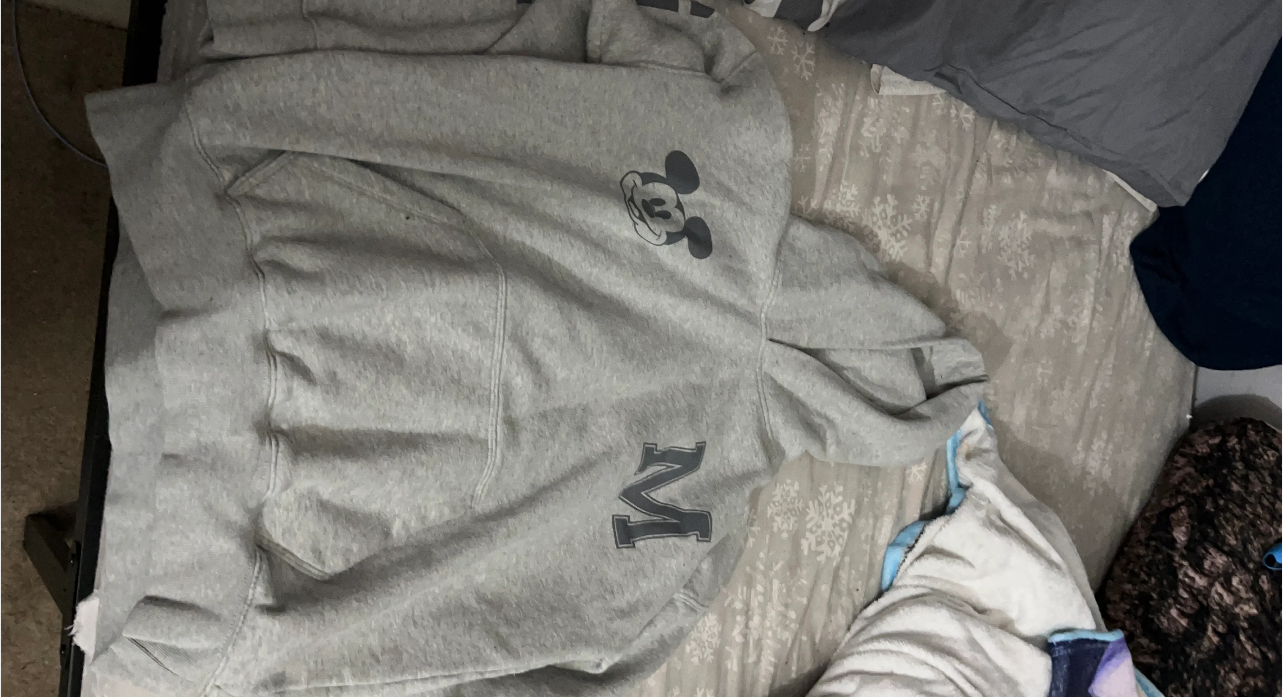 Grey hoodie featuring a Mickey Mouse graphic. It's a pullover style with a front pouch pocket. Made of soft, comfortable material for casual wear.
