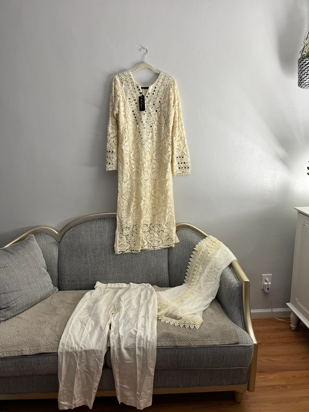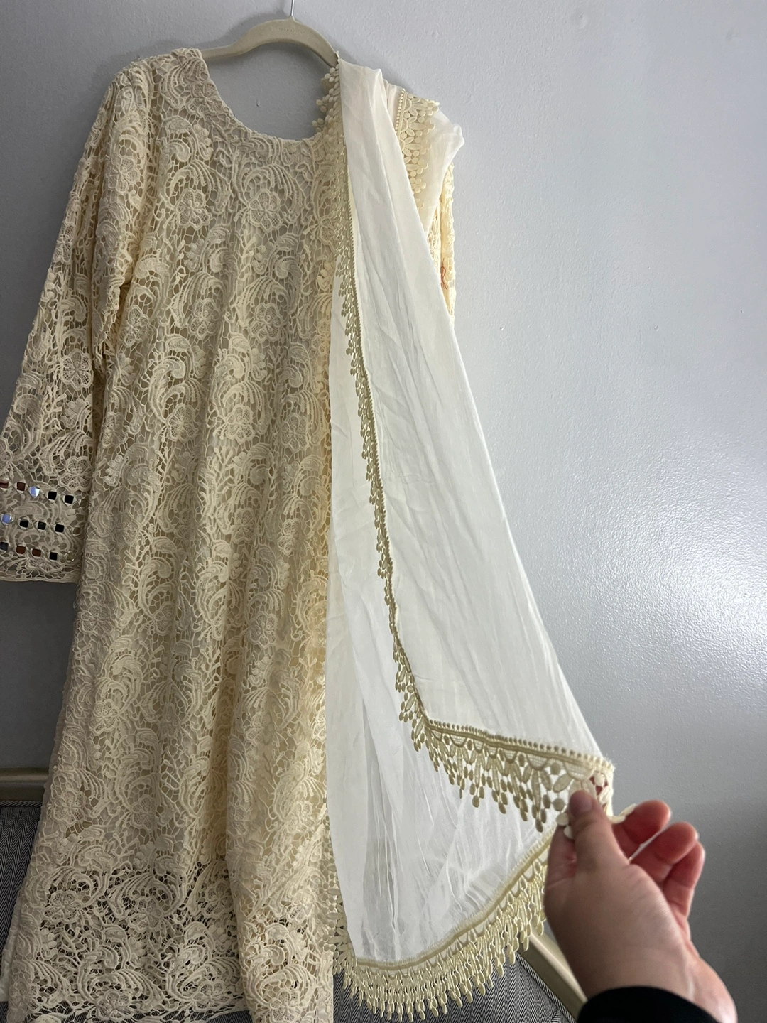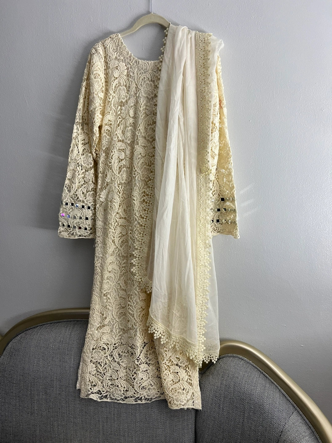 Cream lace dress with mirror work. Comes with a matching dupatta. Long sleeves.new never used pick up only