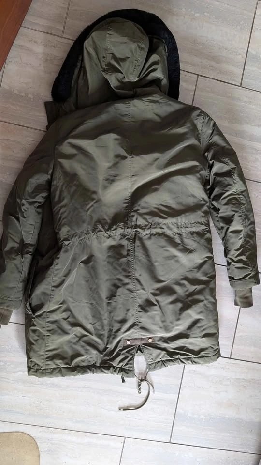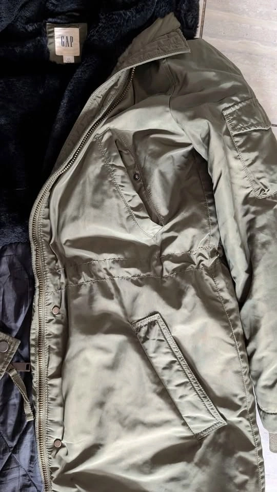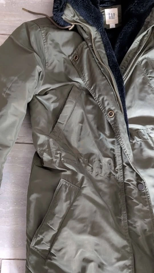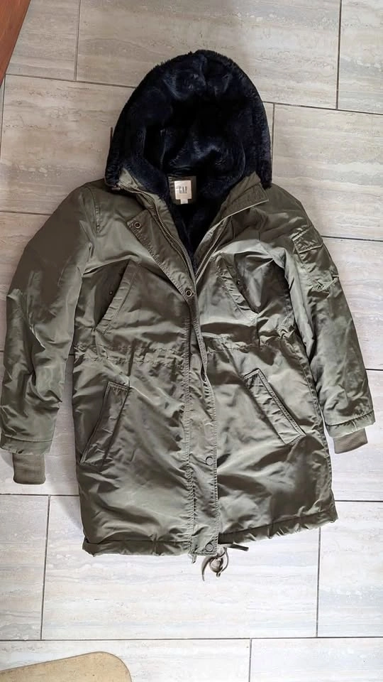 Gap army green and black winter jacket. Size women's small (fits a little closer to a medium). In excellent condition, worn one season. Features several pockets and a waistline tie for added shape. Soft hood and inside lining for warmth and comfort. Located near Greenwood and Danforth area.