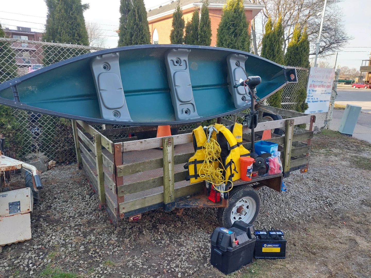 Green Canoe with Trolling Motor and Accessories