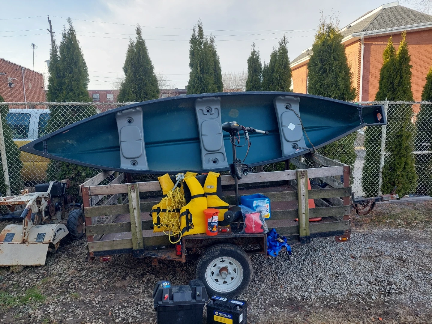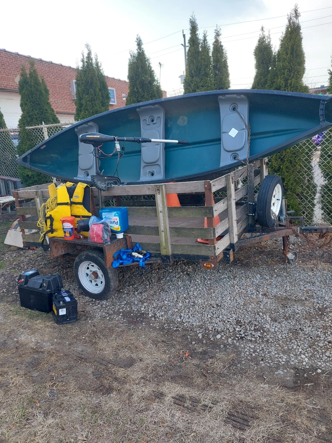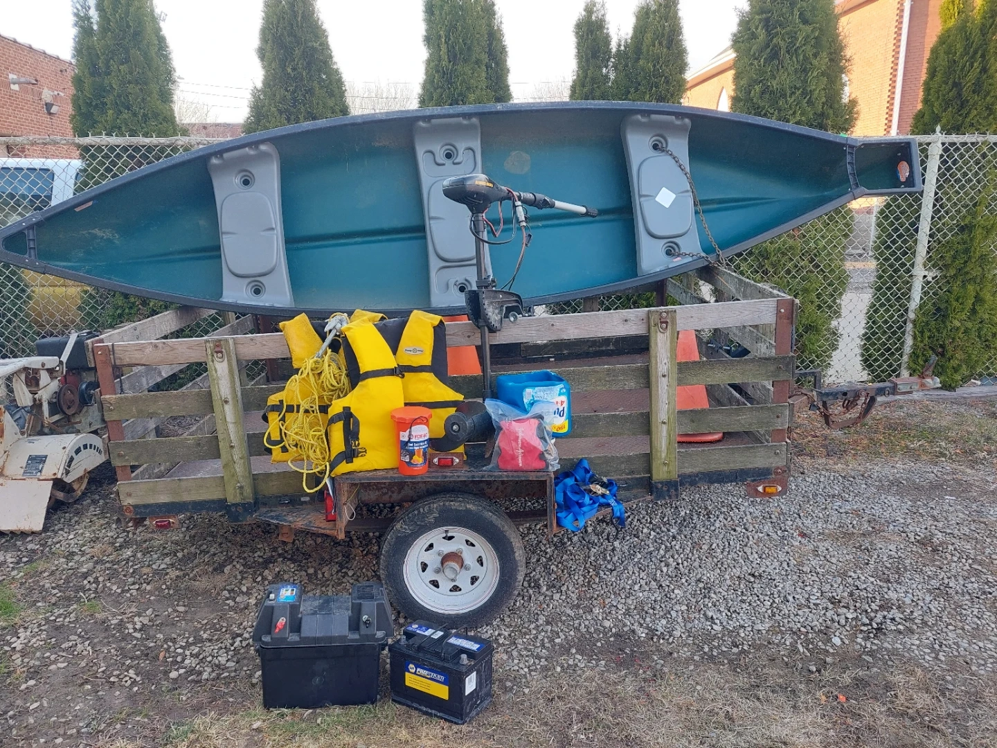 This green canoe comes with a trolling motor, two life jackets, and an orange bucket. It's suitable for paddling on lakes and calm rivers. Comes with one battery