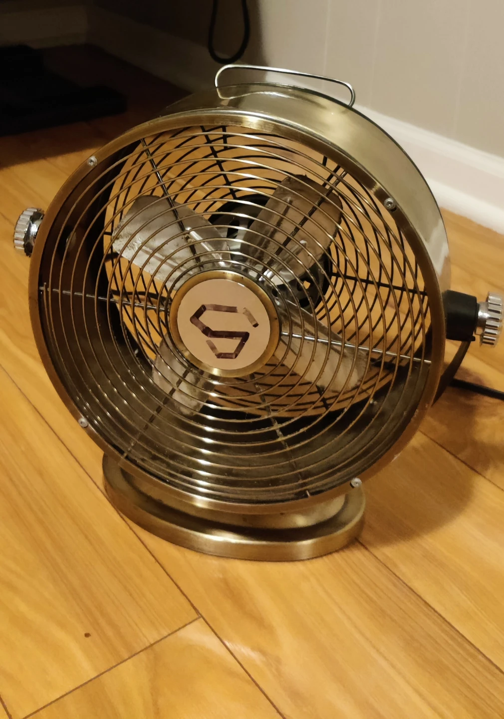 This is a vintage-style desk fan with a metallic brass finish. It features a sturdy base and a safety grille. A simple on/off switch controls its operation. It's great for circulating air in a small space!