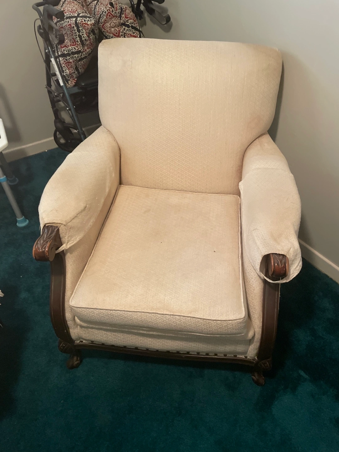 Cream coloured armchair. Wooden armrests. Features a patterned cushion. You will enjoy relaxing and reading in this chair. older but nice just a few stains.