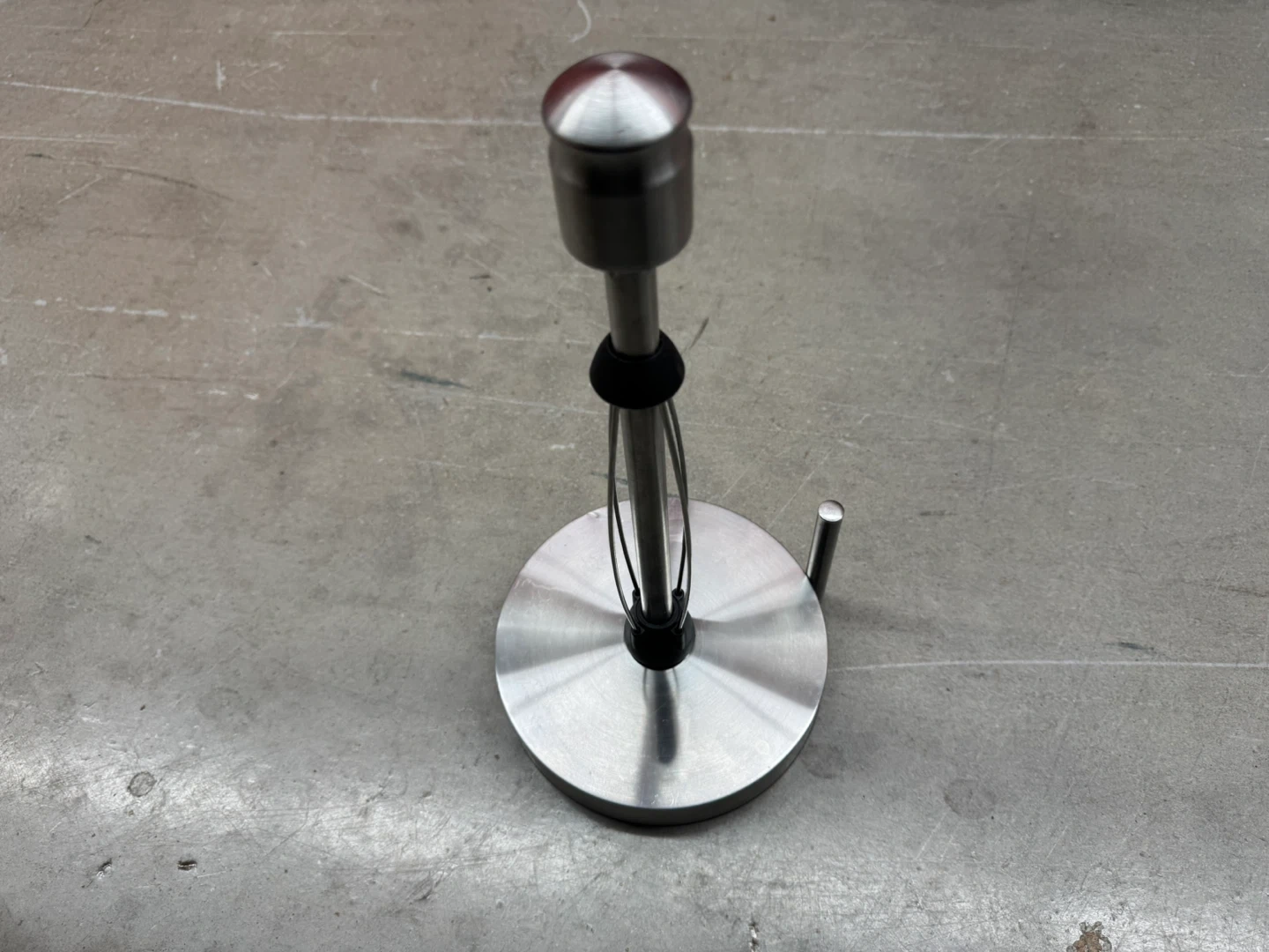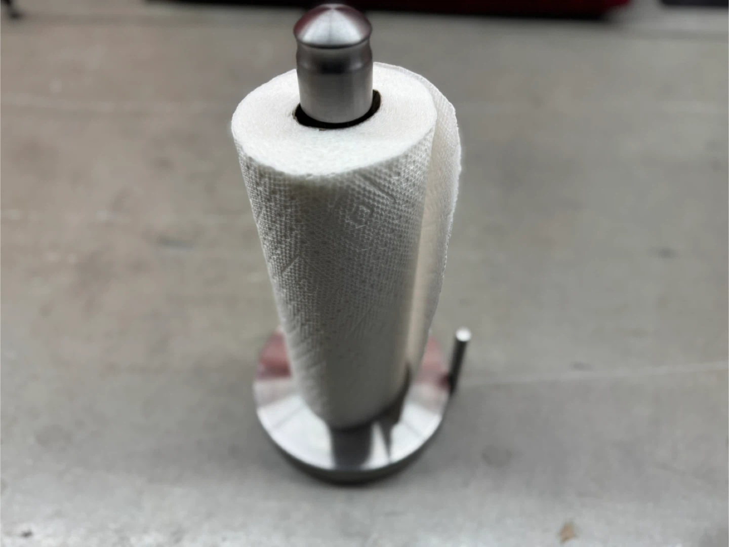 A modern stainless steel paper towel holder. It's designed for easy tear-off and has a sturdy base. This holder keeps your kitchen counter tidy and your paper towels accessible.