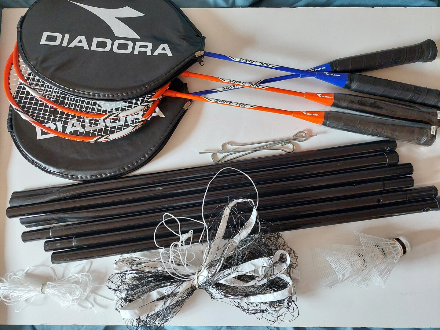 - Diadora Strike 6000 badminton set with rackets, net, and shuttlecock