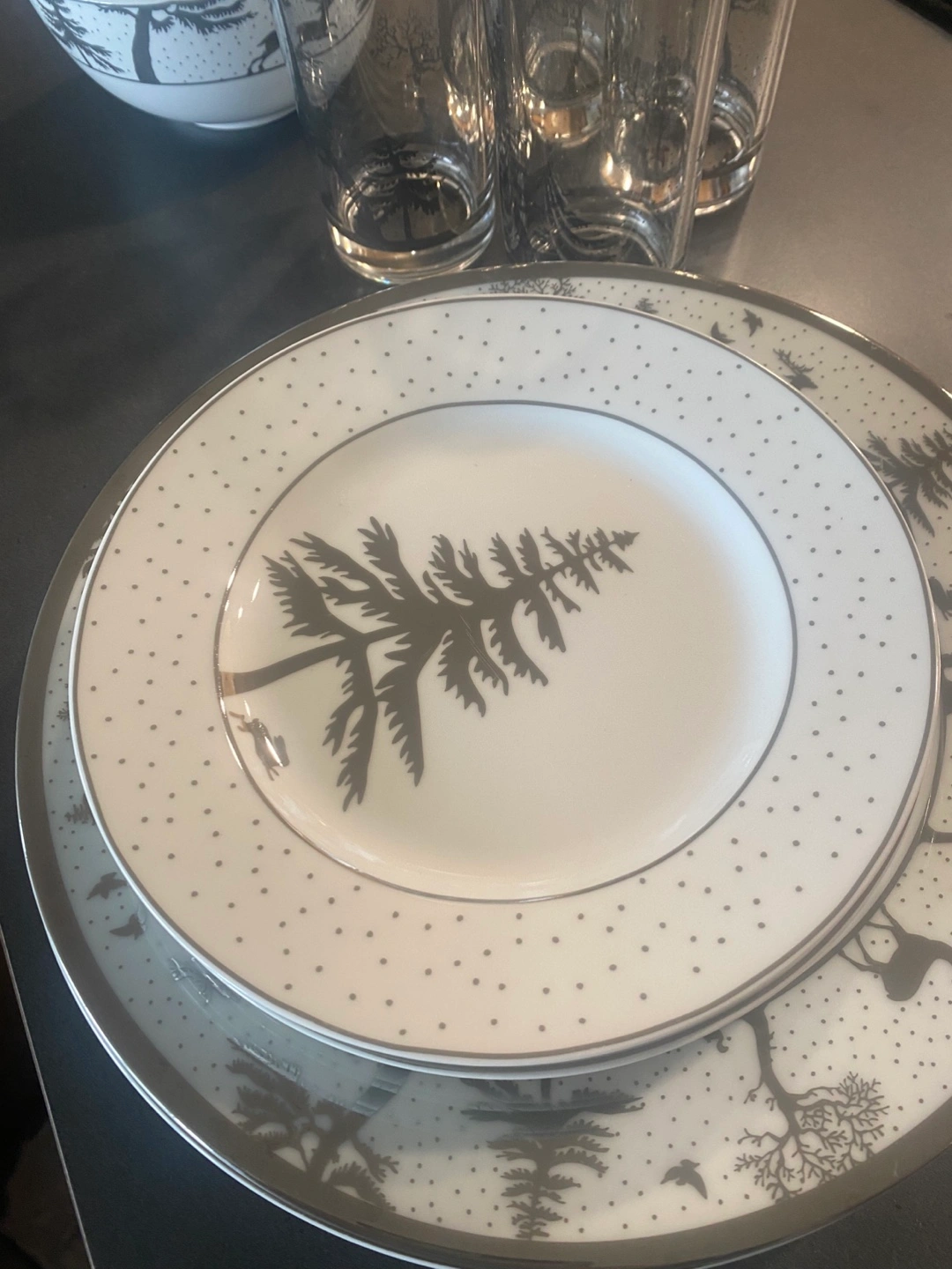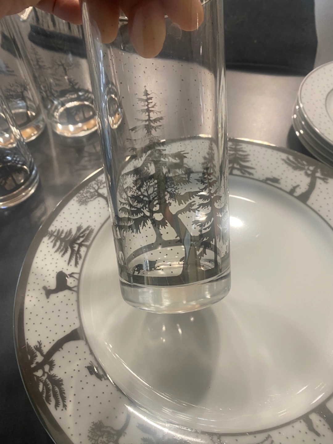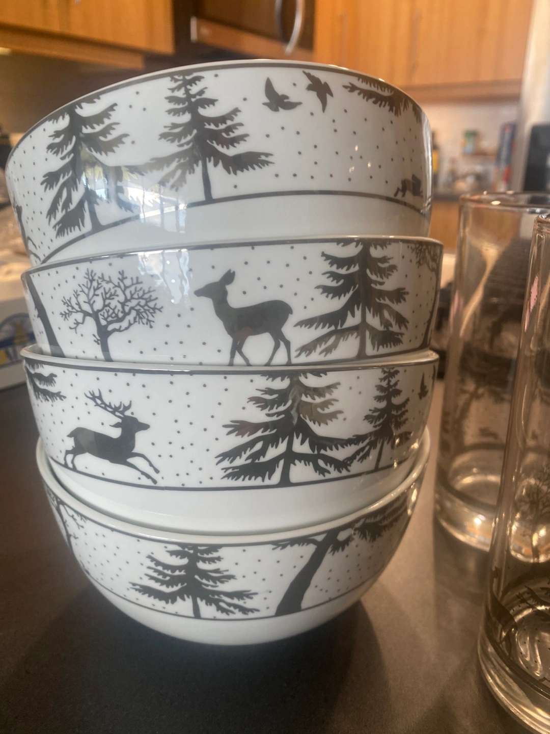 I'm selling a set of winter woods themed dinnerware. It includes bowls, glasses, and plates. The design features trees, deer, and birds in a lovely winter scene. Perfect for adding a cozy touch to your dining table during the colder months!