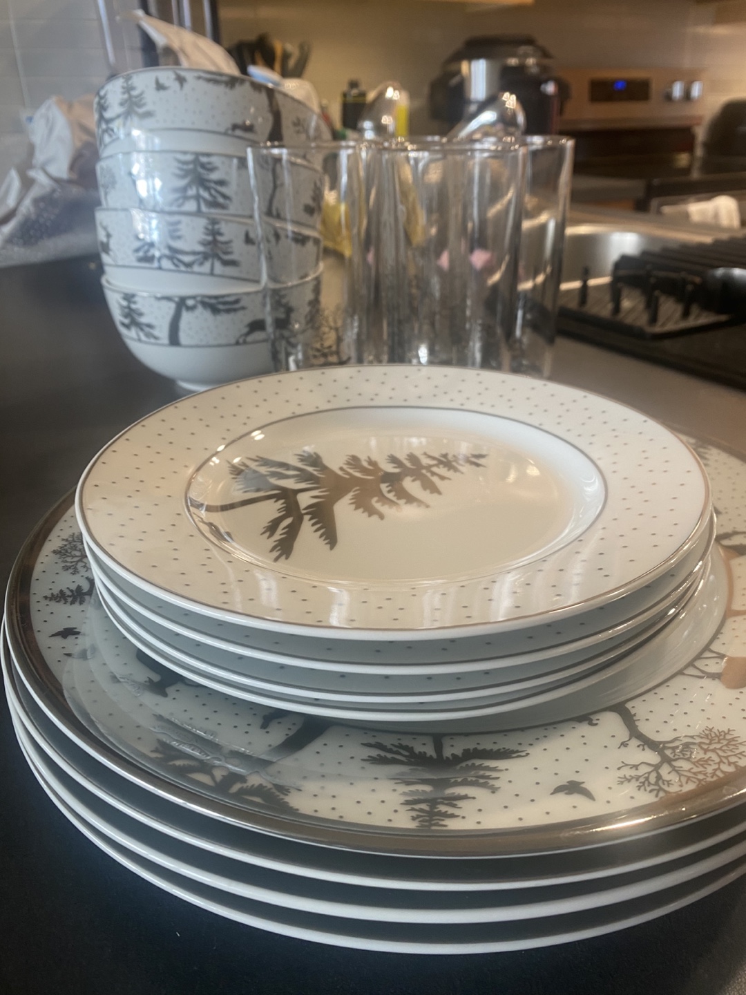 I'm selling a set of winter woods themed dinnerware. It includes bowls, glasses, and plates. The design features trees, deer, and birds in a lovely winter scene. Perfect for adding a cozy touch to your dining table during the colder months!