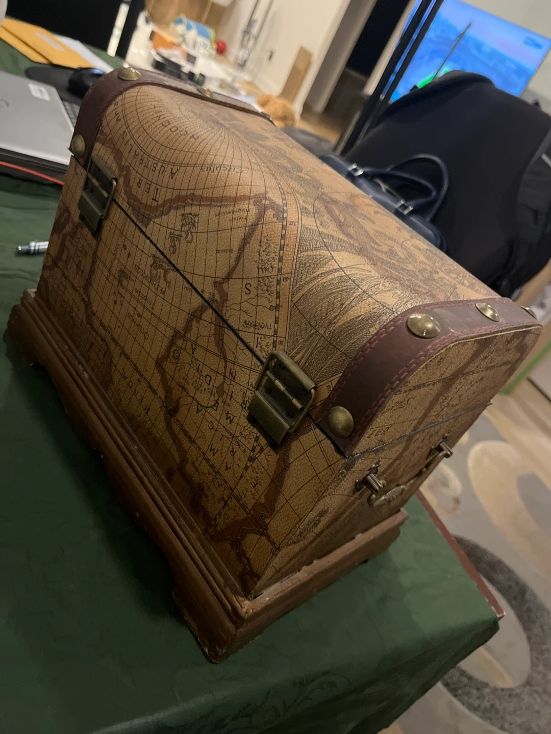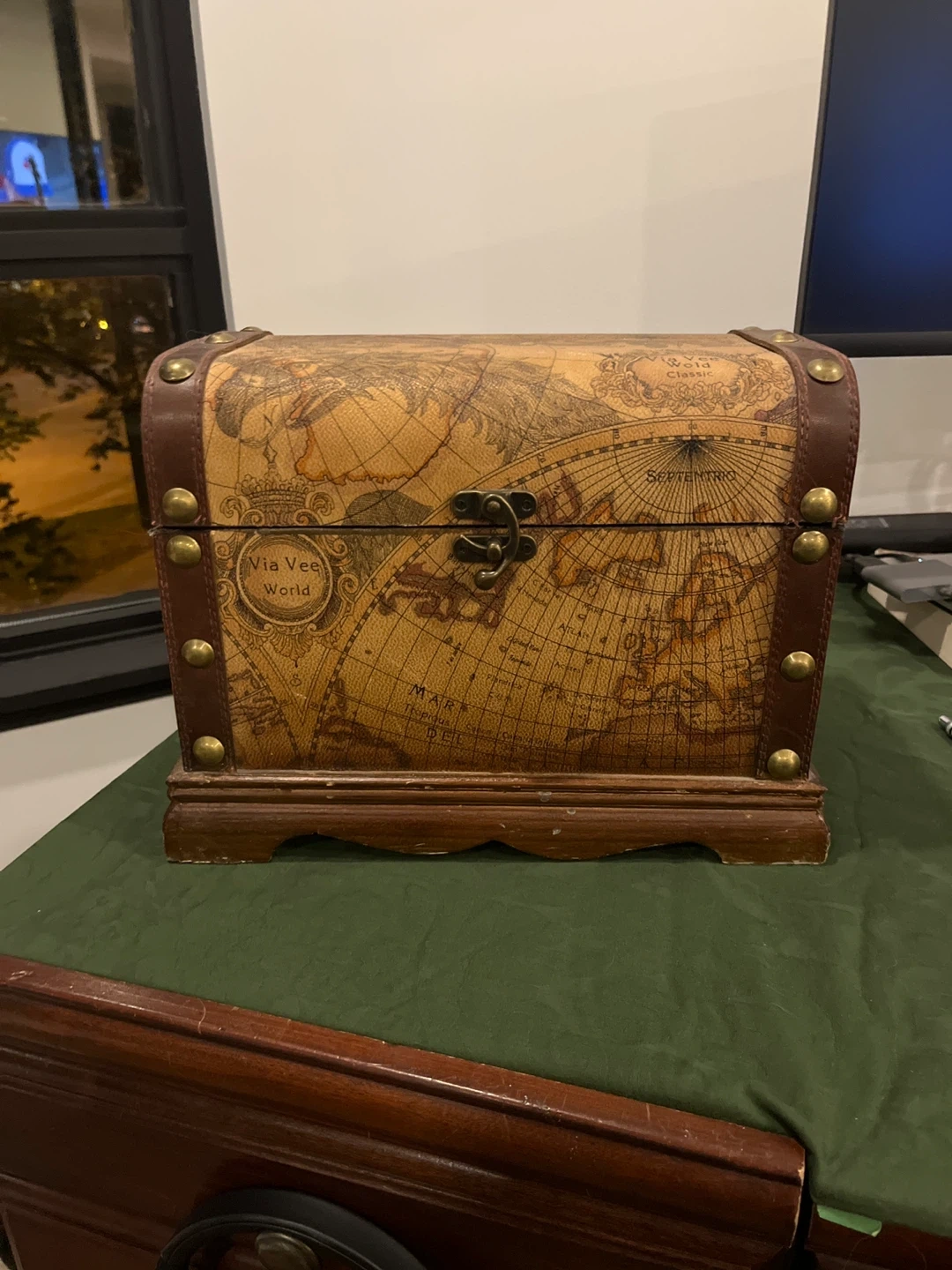 210Selling a charming Via Vee World Classic treasure chest! It has a unique map design and a classic, vintage look. Perfect for adding a touch of adventure to your home decor.