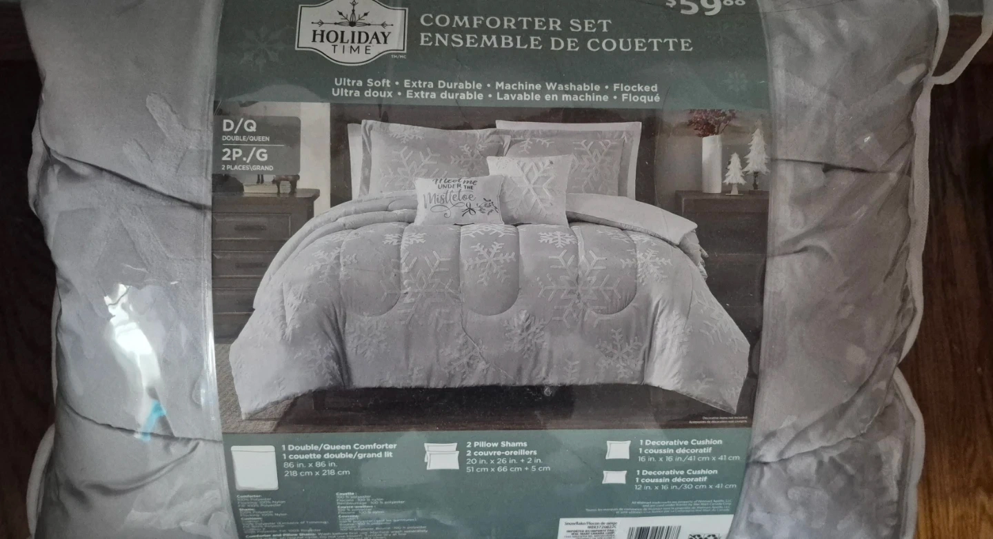 This 5-piece comforter set features a snowflake design in a light grey colour. It's ultra soft and extra durable, and machine washable. Includes 1 double/queen comforter, 2 pillow shams, and 2 decorative cushions.