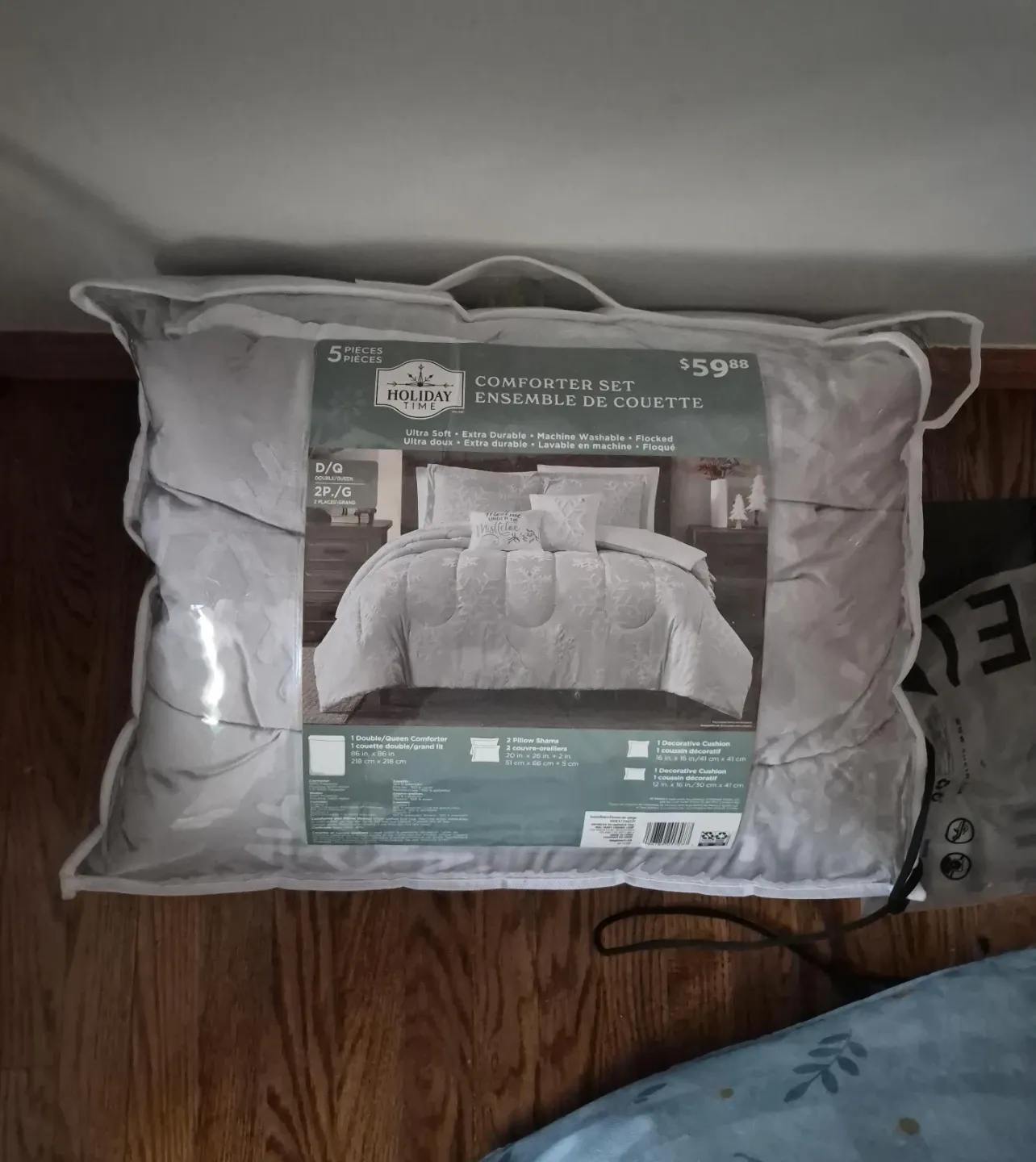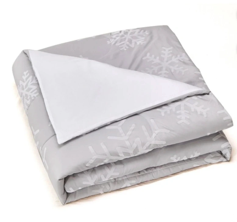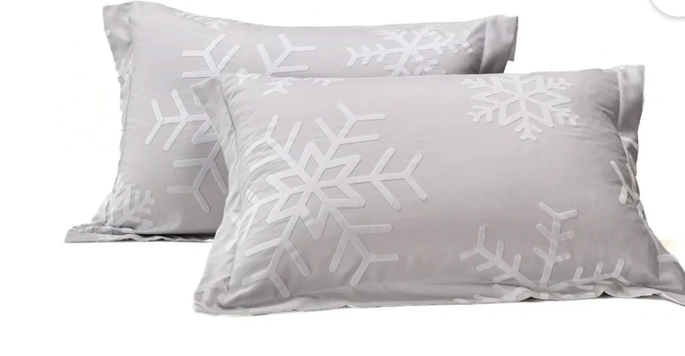 This 5-piece comforter set features a snowflake design in a light grey colour. It's ultra soft and extra durable, and machine washable. Includes 1 double/queen comforter, 2 pillow shams, and 2 decorative cushions.