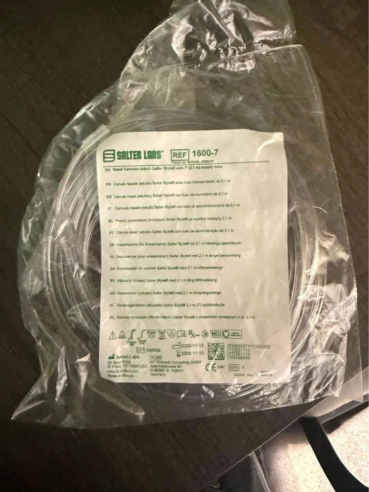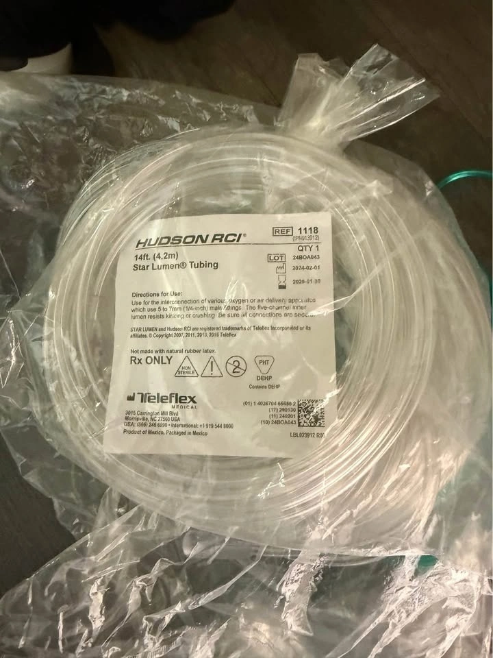 14 feet (4.2 meters) of oxygen tubing with Star Lumen design to resist kinking. Standard connectors on both ends. Includes T-shaped tubing connectors. Also includes 8x 4' cannulas, 4x 7' cannulas, and 1x 2' cannula. Cannulas have soft, curved nasal prongs and 3-channel, kink-resistant tubing, suitable for low to medium oxygen flow. All items are new and never used.