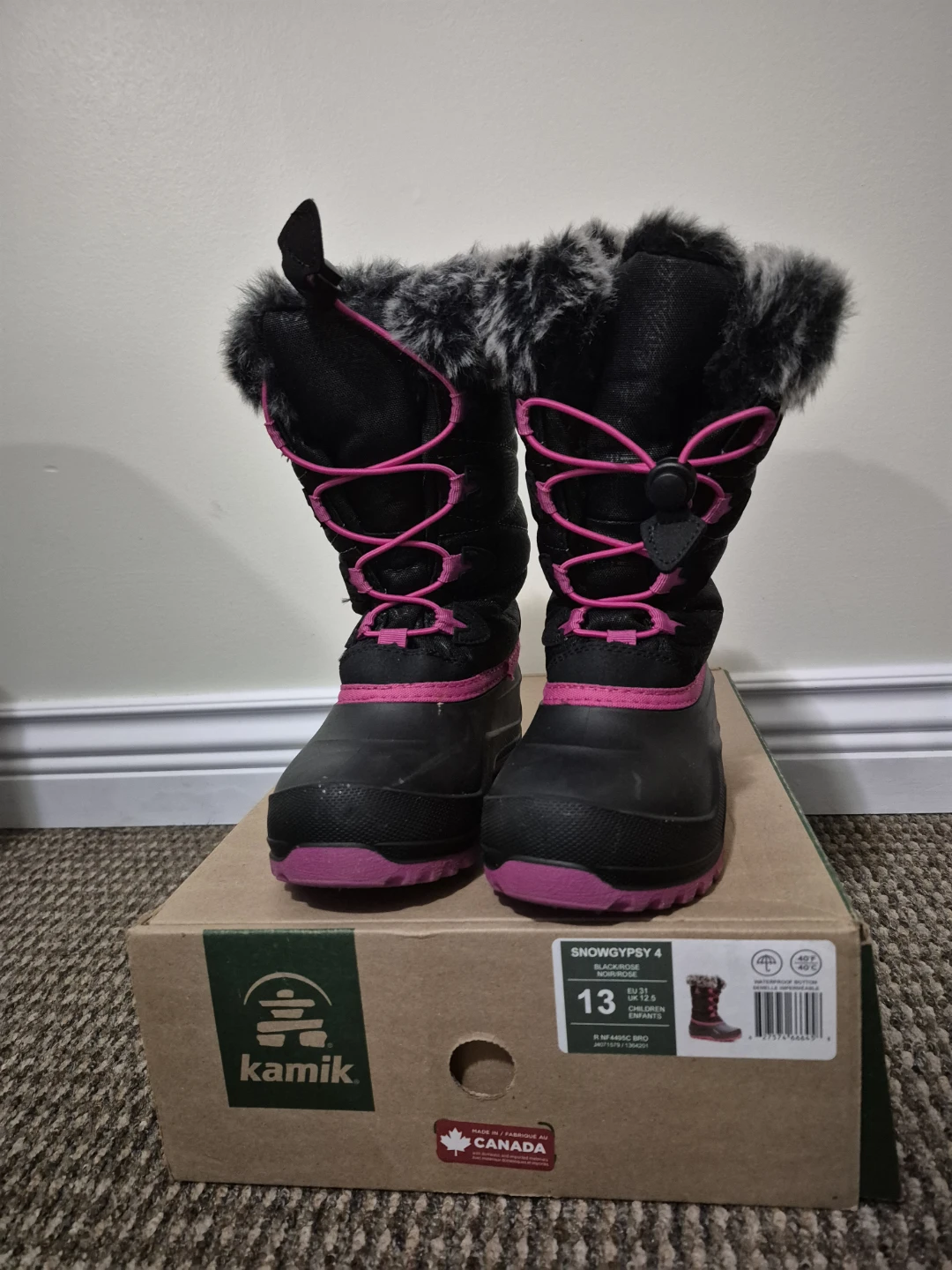 Selling a pair of Kamik Snow Gypsy 4 boots in black and rose! They're in great condition and perfect for keeping little feet warm and dry this winter. Size 13