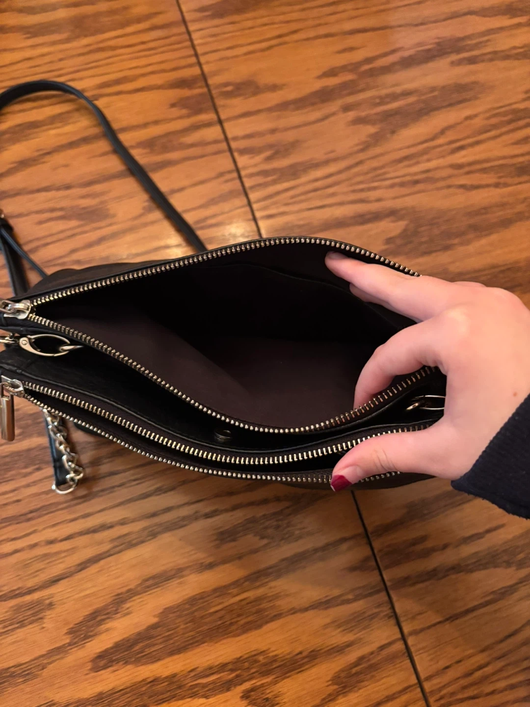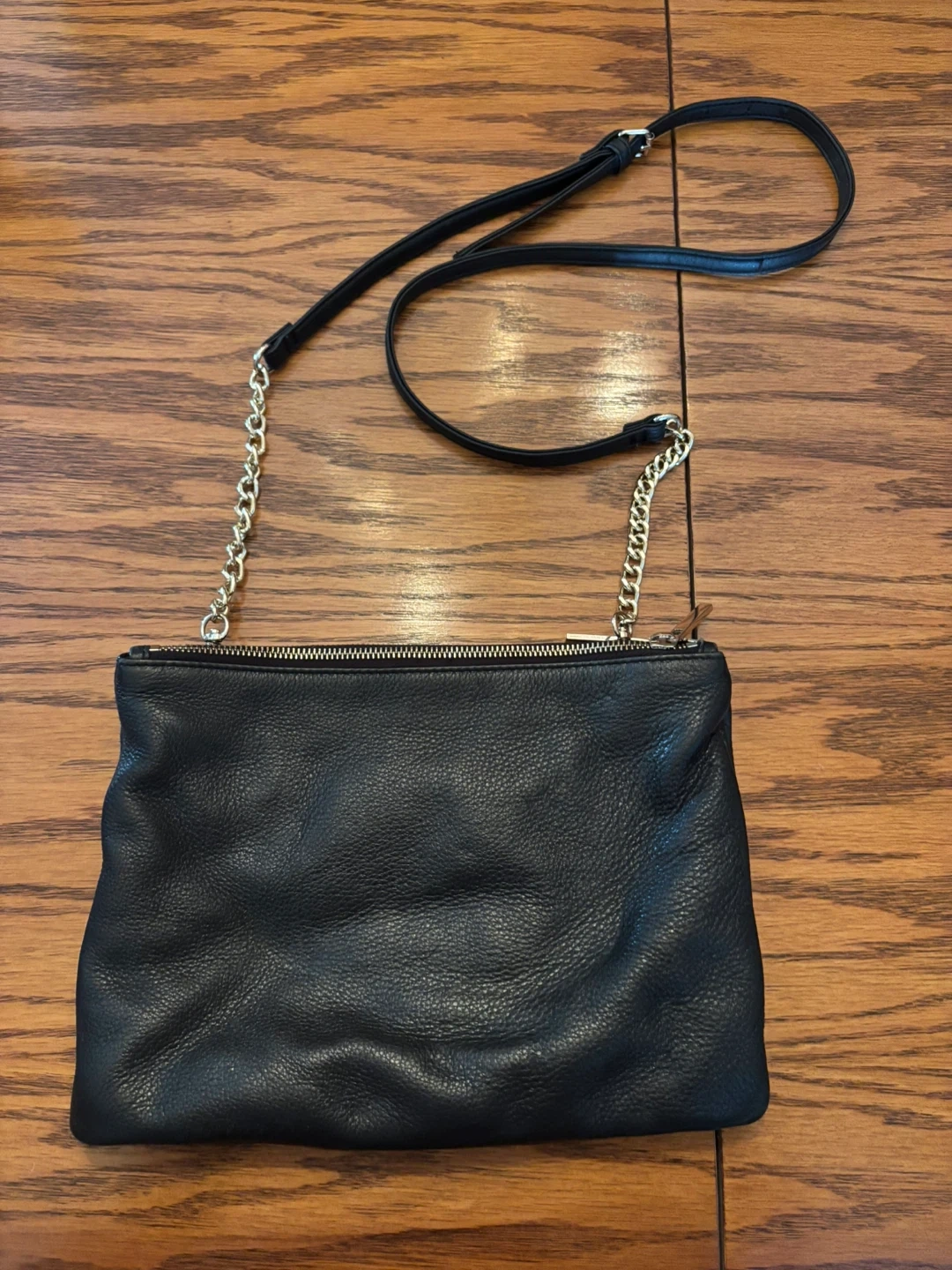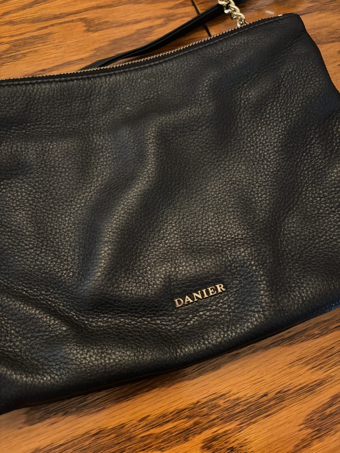This is a black leather crossbody bag from DANIER. It has multiple zippered compartments inside for organization. The strap is adjustable and features a gold chain accent.