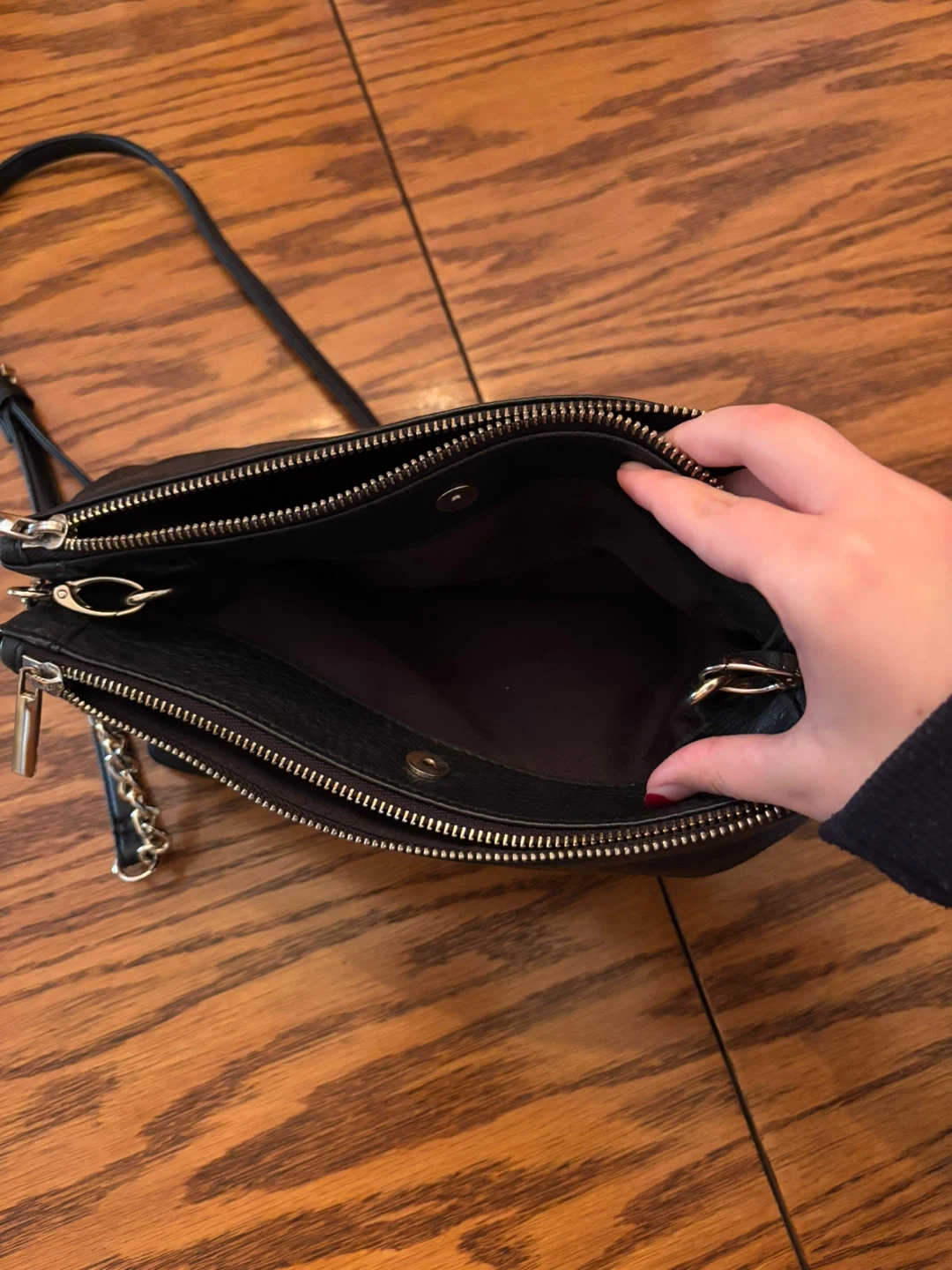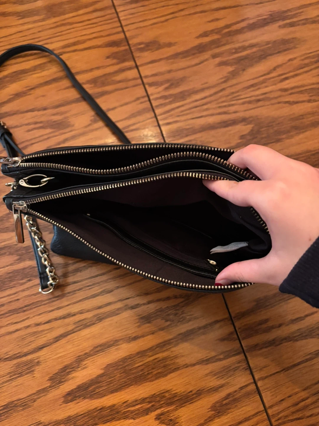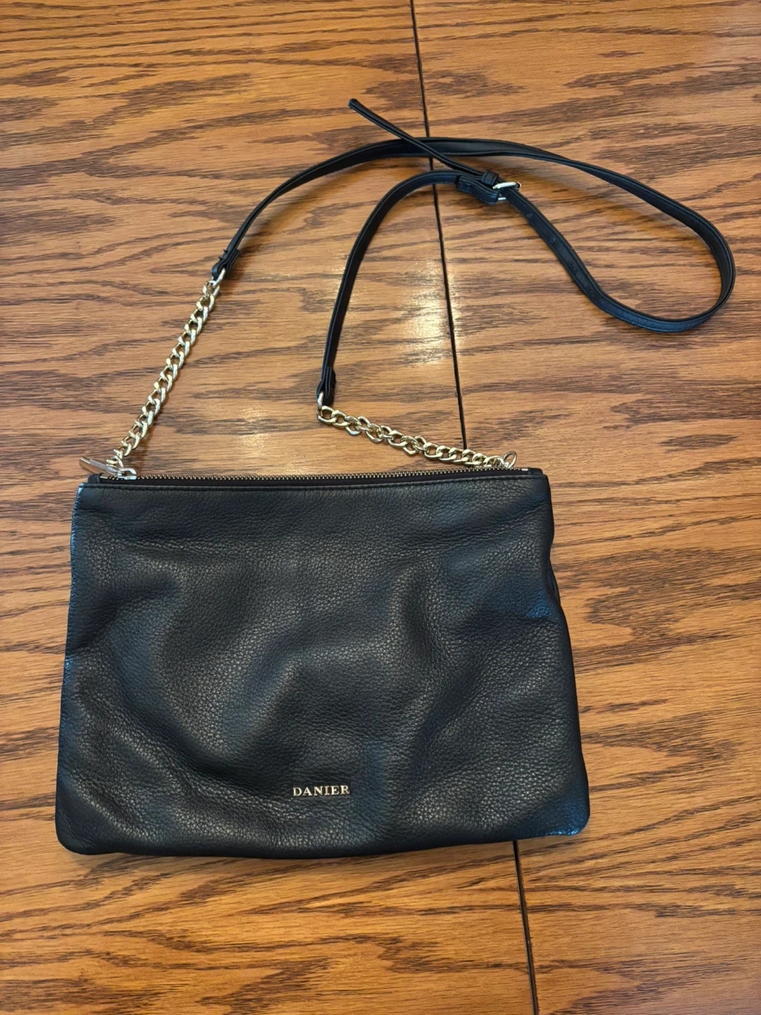 This is a black leather crossbody bag from DANIER. It has multiple zippered compartments inside for organization. The strap is adjustable and features a gold chain accent.