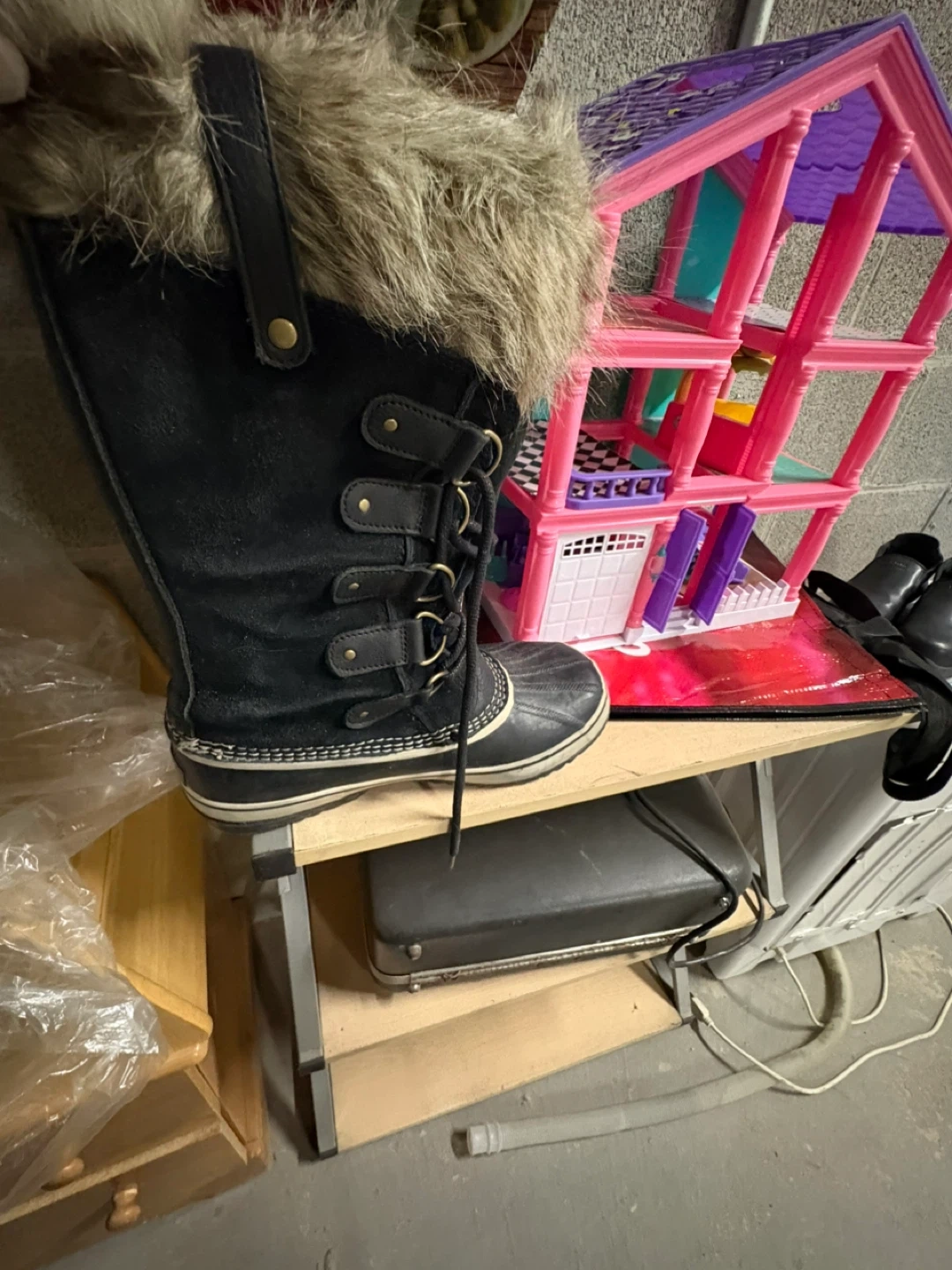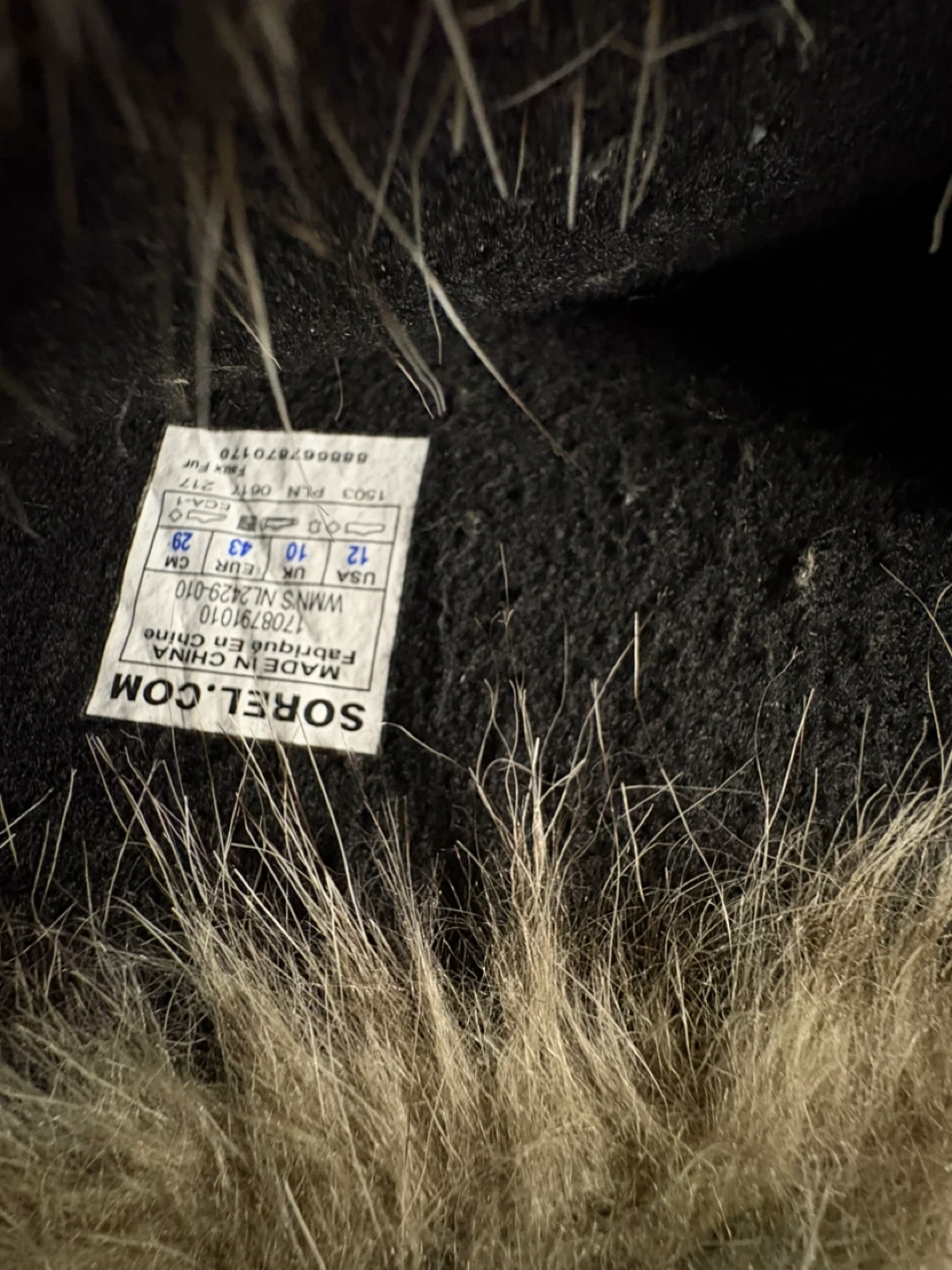 Sorel winter boots in black suede with a faux fur trim. Women's size 12 (US), 10 (UK), 43 (EUR). These boots are made in China. They feature a lace-up front and a durable rubber sole. Great for keeping your feet warm in the snow!