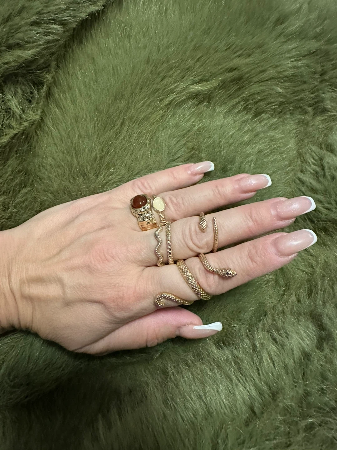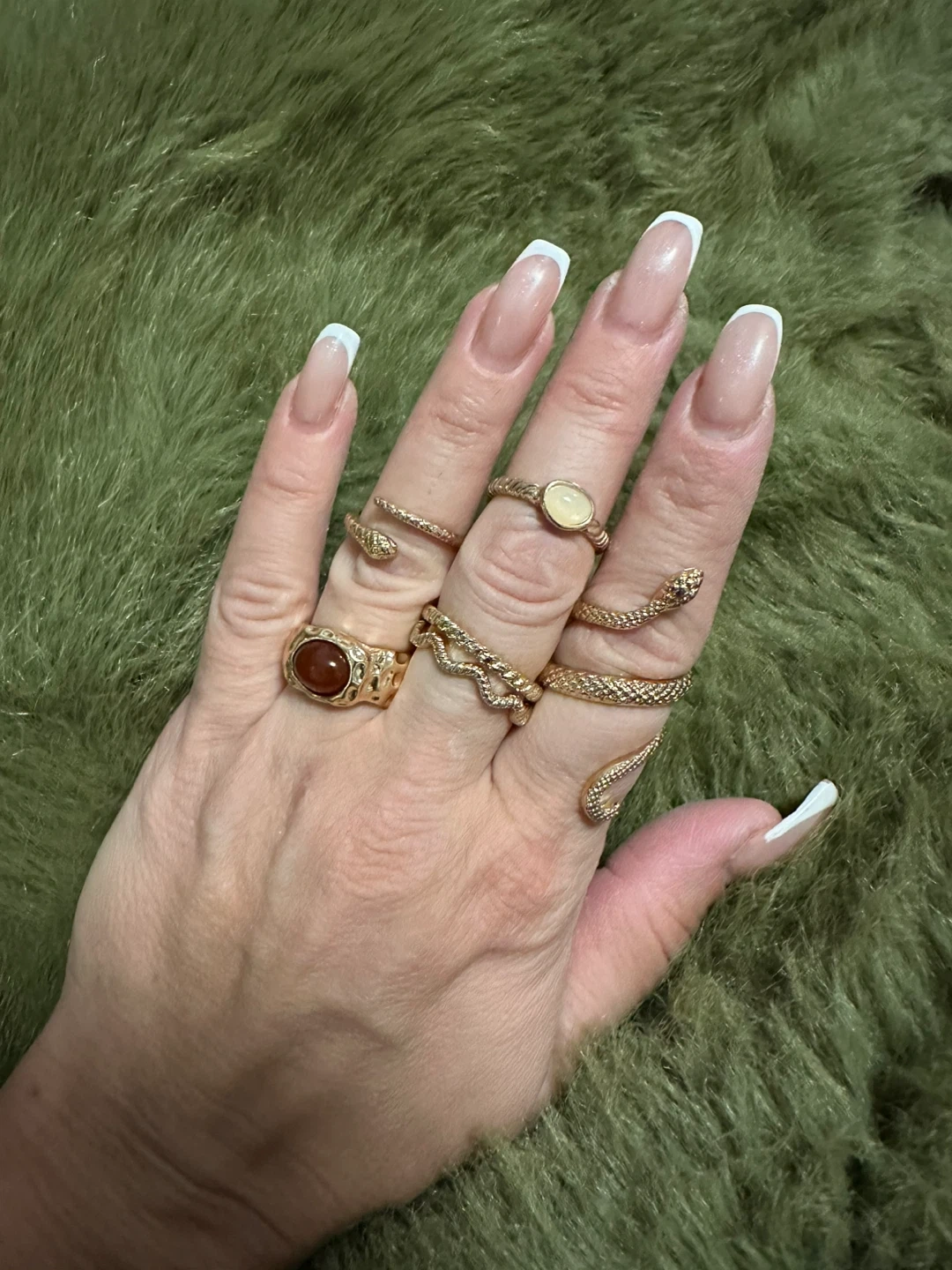 A set of five gold-tone rings with snake motifs. Includes two rings with stones, one large with a dark reddish-brown stone and a smaller one with a light oval stone. These rings add a unique touch to any outfit!