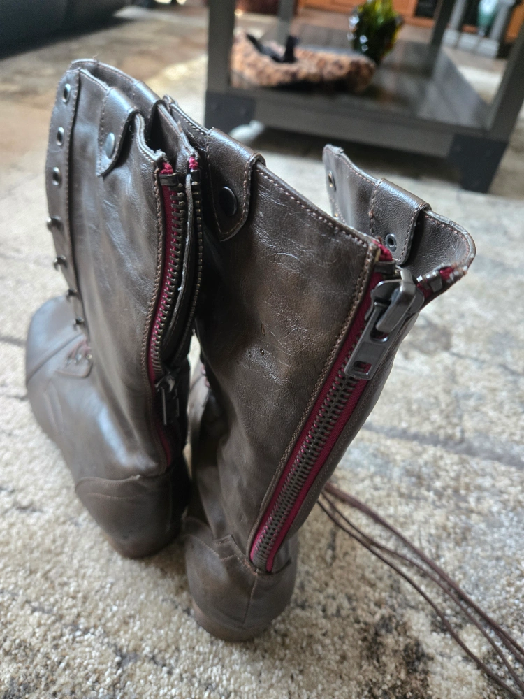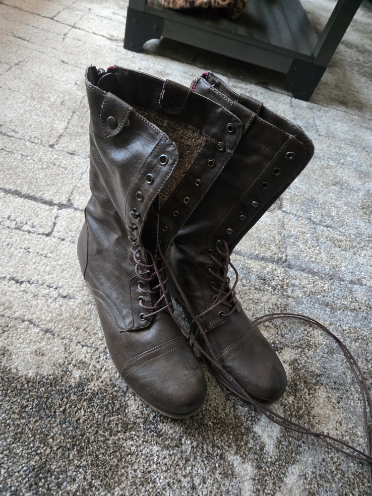 Selling a pair of brown Victoria's Secret boots in size 10. They have a lace-up front and zipper on the side. Great for fall! Bought never worn