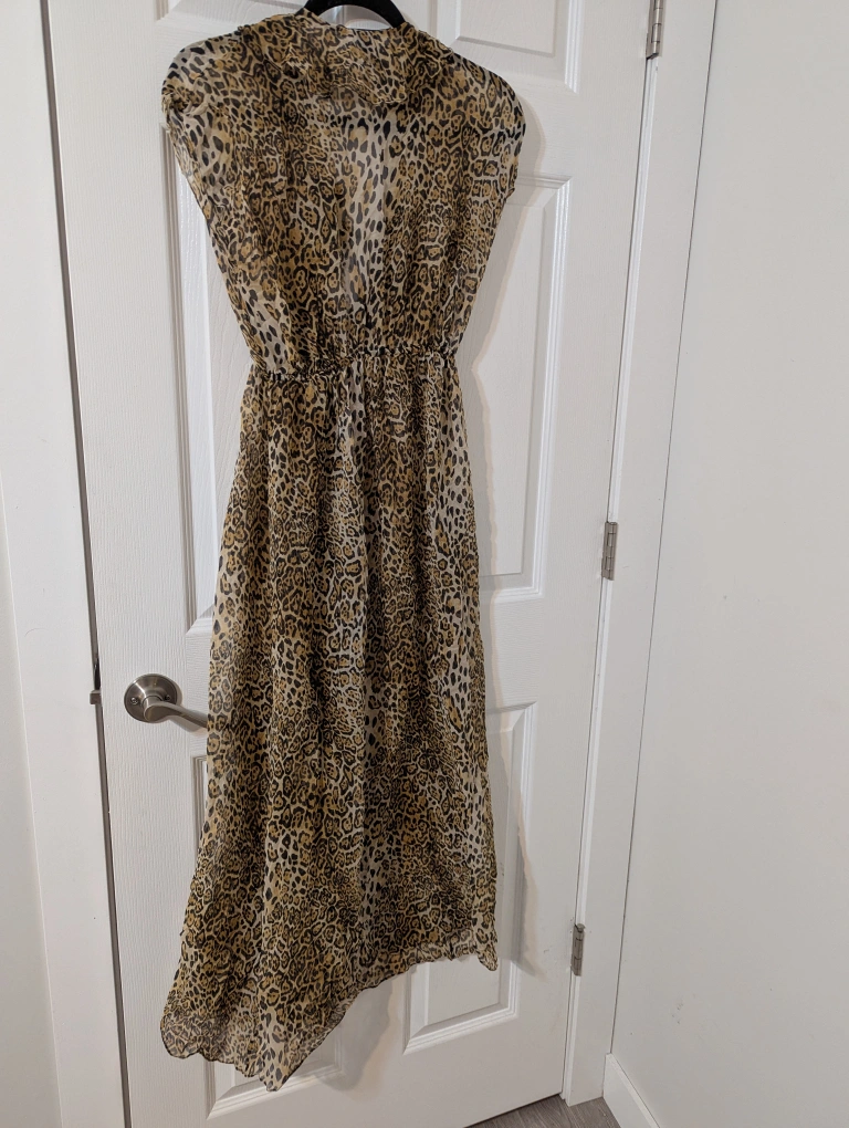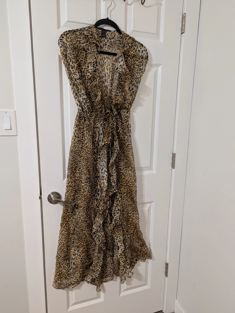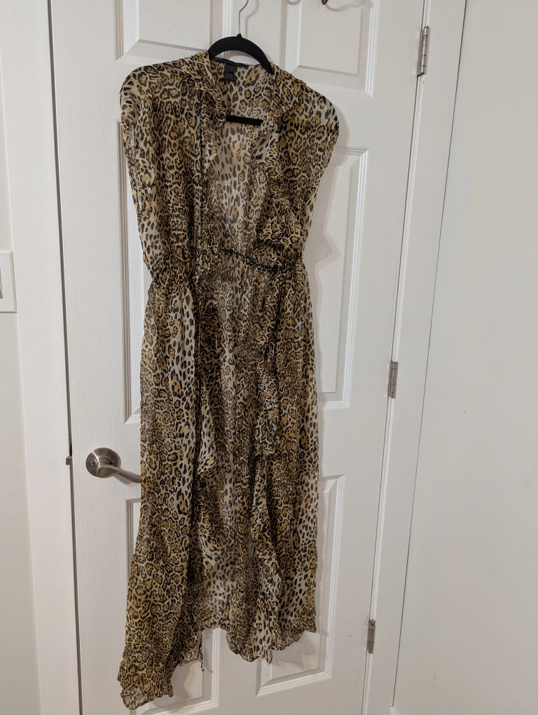 Lightweight sheer wrap dress. Leopard print. One size fits most. Features a ruffled asymmetrical hemline. Bought for over $100 but never wore it. $30