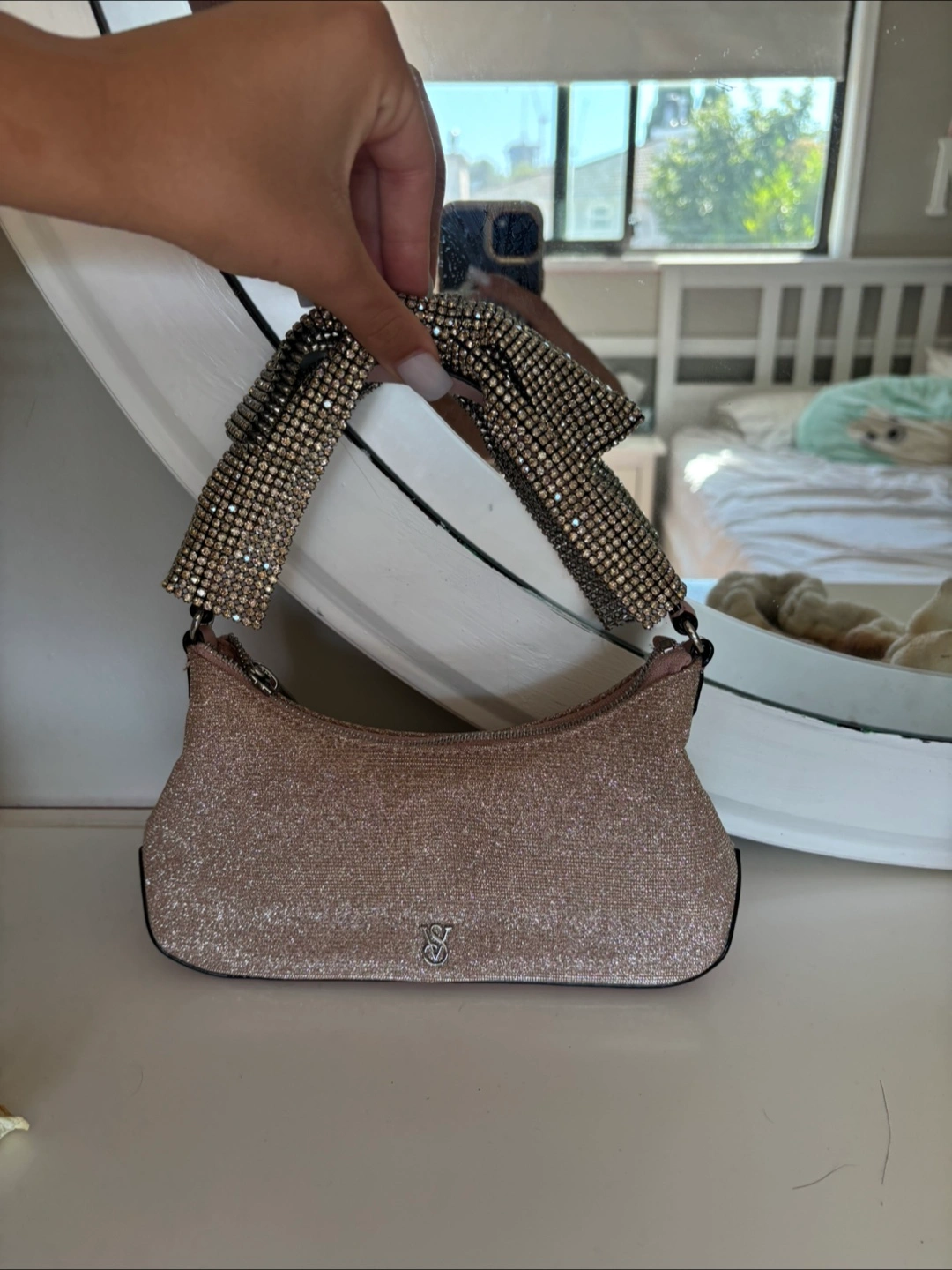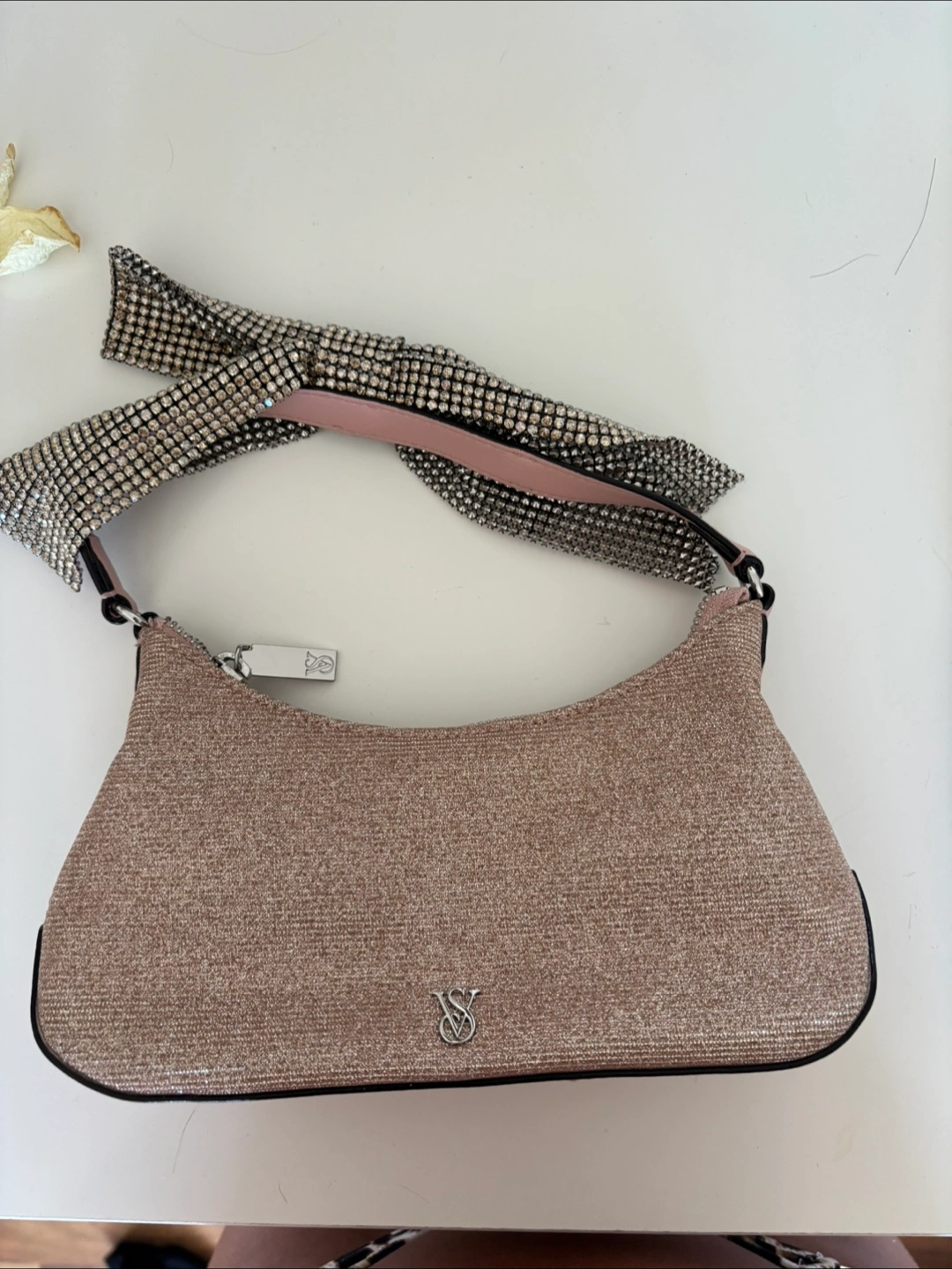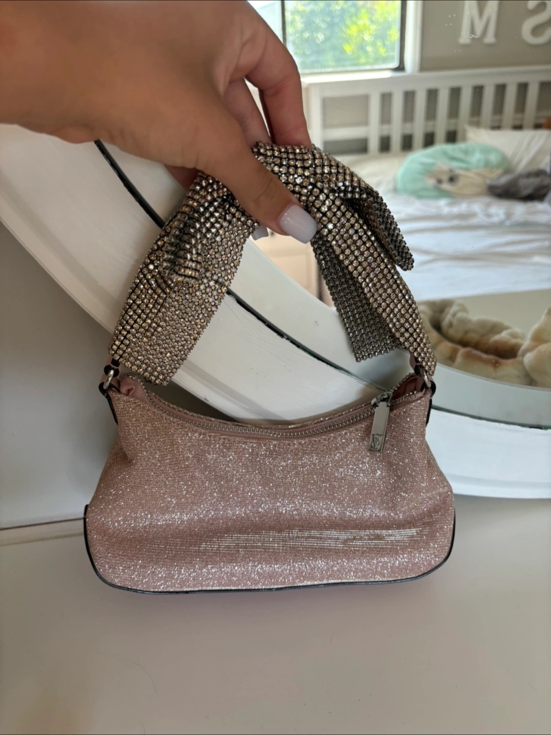 Selling a cute Victoria's Secret Pink mini bag! It has a rhinestone handle and a glittery pink body. Perfect for a night out or just adding a little sparkle to your day
