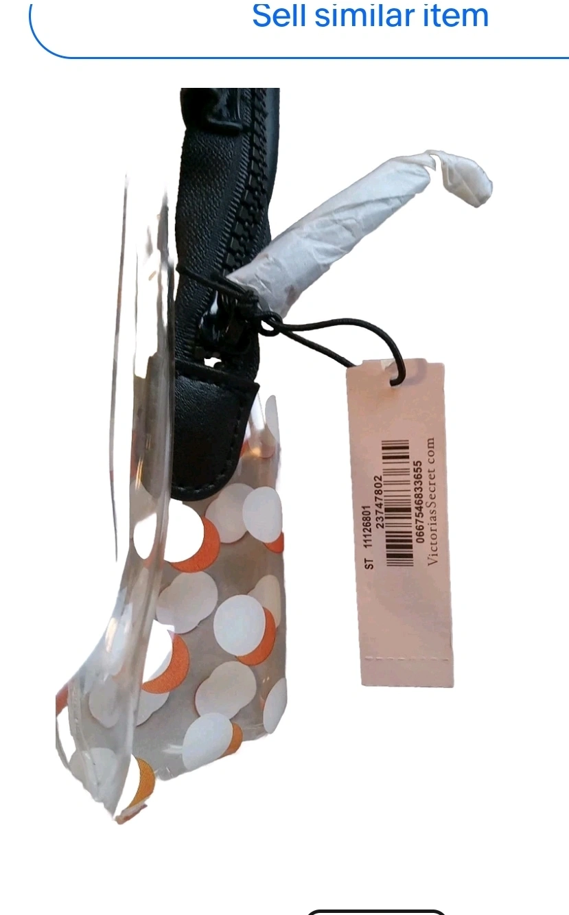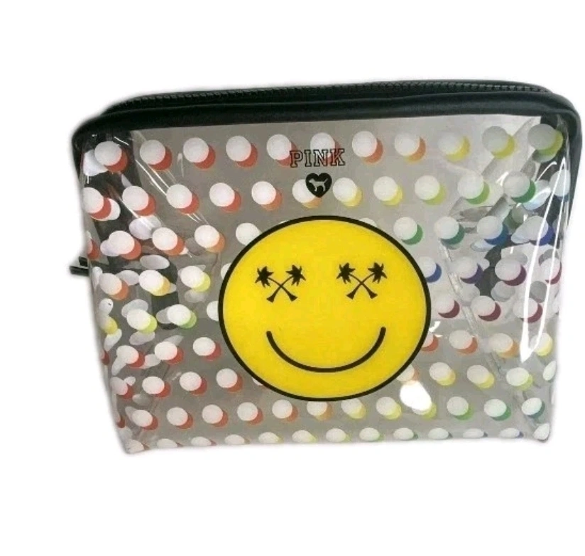 Check out this super cute Victoria's Secret PINK cosmetic bag! It features a fun smiley face design on a clear, polka-dot background. Perfect for keeping your makeup and essentials organized on the go