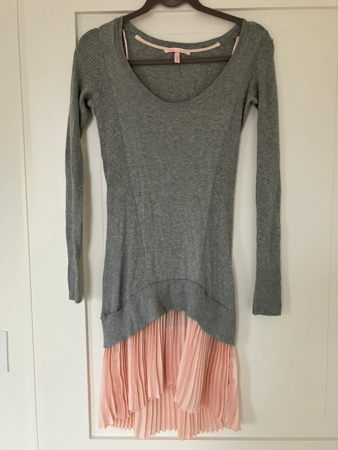 108A sweater dress with a ribbed top and a pleated skirt. It has long sleeves. A lovely outfit for a relaxing day out. Size XS but would also fit a Small.