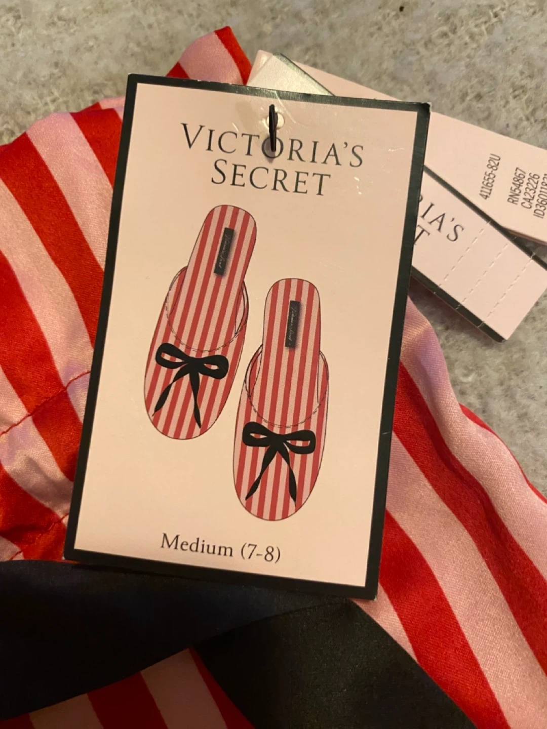 1000+These Victoria's Secret slippers are in a cute red and pink striped pattern with a black bow. They are a size medium, which fits sizes 7-8. Comes with the original bag!
