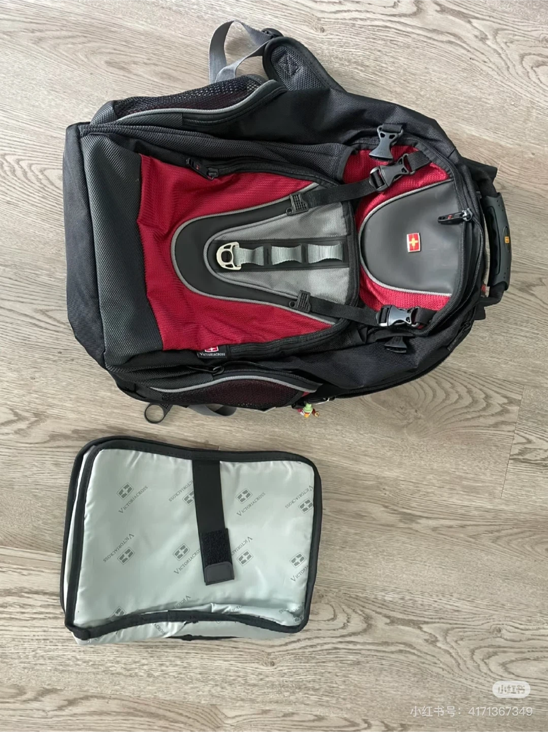 10Victorinox backpack in black, red, and grey. It comes with an insulated cooler compartment, perfect for keeping your lunch or drinks cold on the go! The backpack has multiple compartments and adjustable straps for comfortable carrying. Great for school, work, or travel!