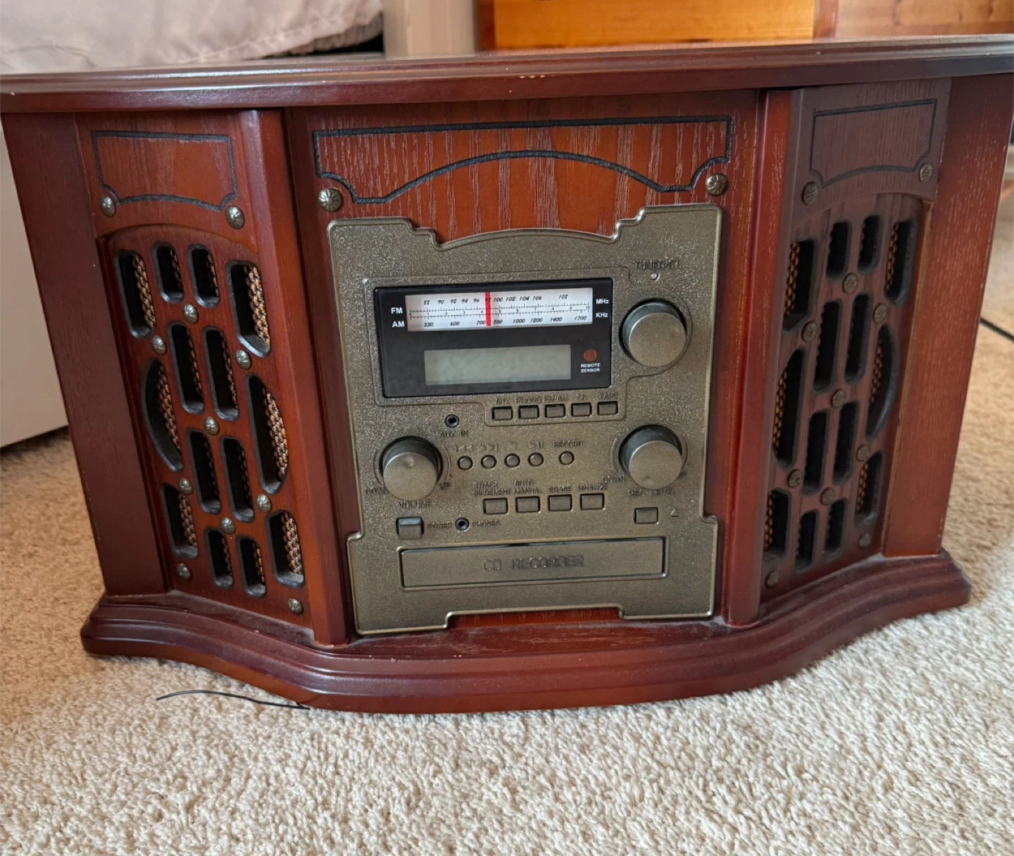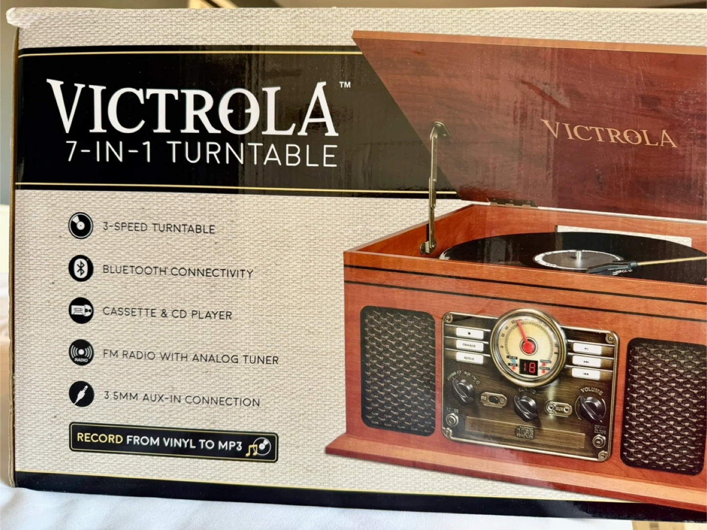 Selling a Victrola 7-in-1 turntable! It has a 3-speed turntable, Bluetooth connectivity, cassette and CD player, FM radio with analog tuner, and a 3.5mm aux-in connection. It can also record from vinyl to MP3. Comes with the box!