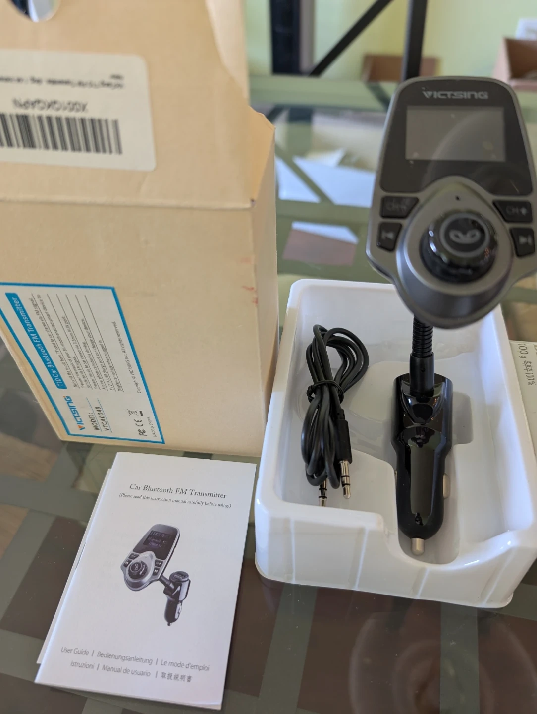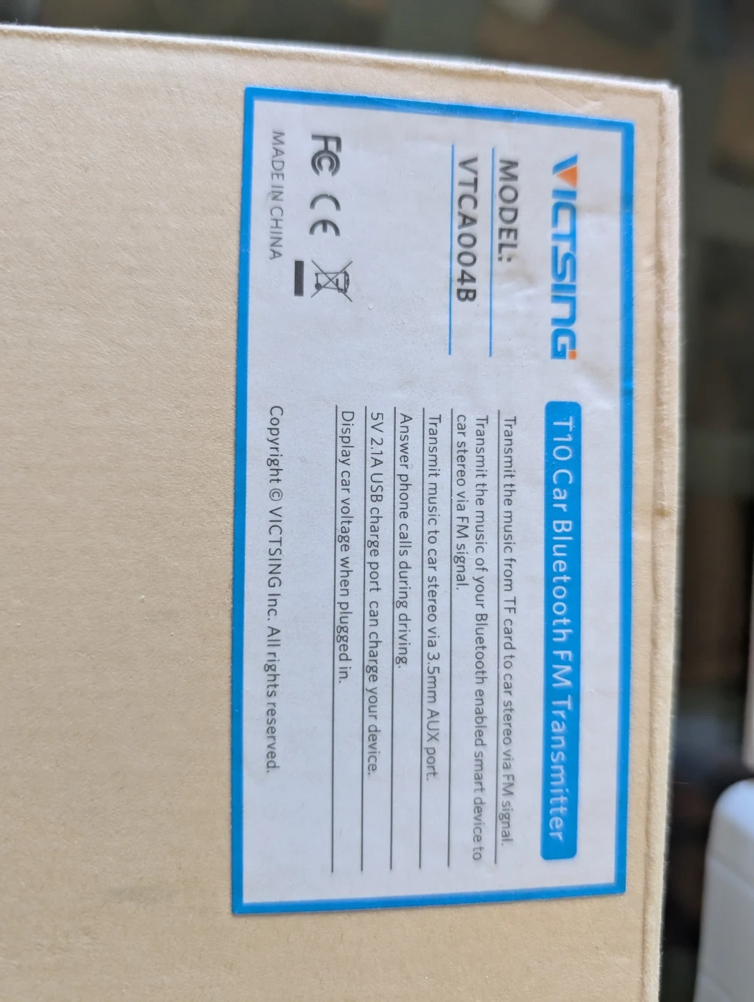 55Selling a Victsing T10 Car Bluetooth FM Transmitter. It comes with the original box and user guide. It can transmit music from a TF card to your car stereo via FM signal, or transmit music to your car stereo via a 3.5mm AUX port. You can also answer phone calls while driving and charge your device with the 5V 2.1A USB charge port