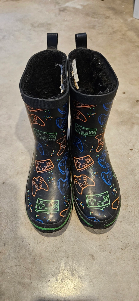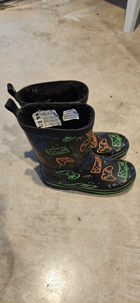 23These children's rain boots are perfect for puddle jumping! They're a size 12 and feature a fun video game controller pattern. Great for keeping little feet dry on rainy days. They are used but still in very good condition.