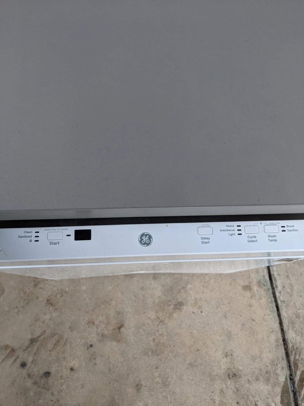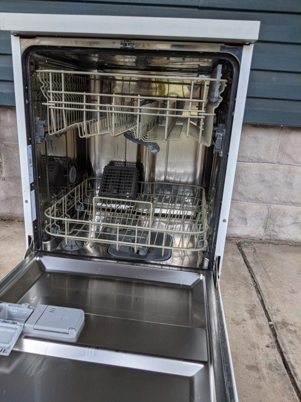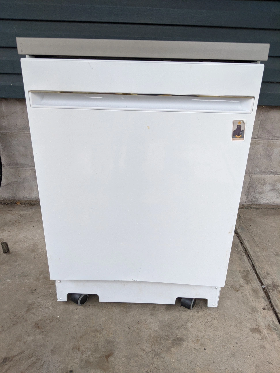 White portable dishwasher. Features multiple wash cycles, adjustable racks, and sanitize option. Good used condition. Wheels for easy movement.