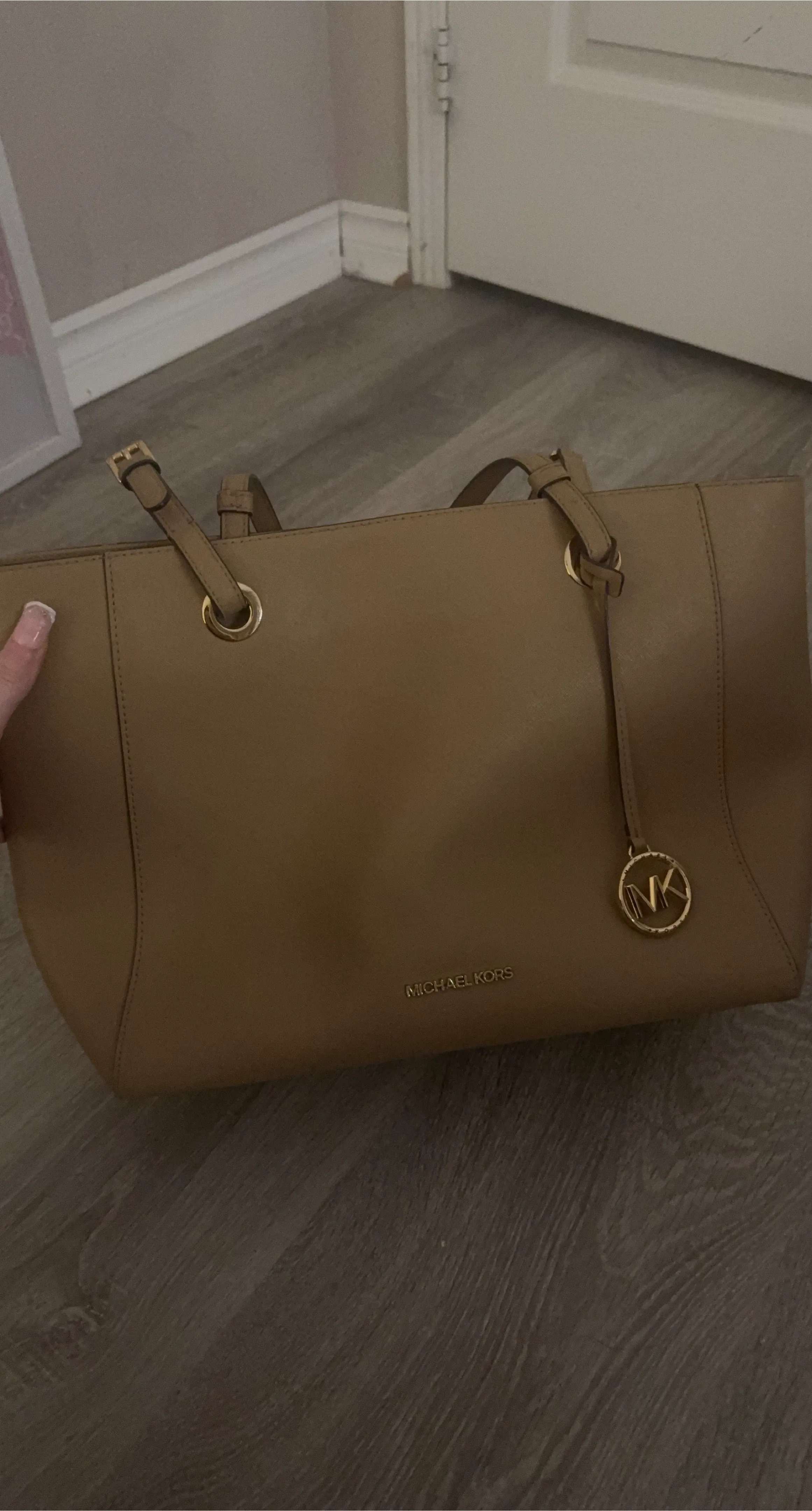 A Michael Kors tote bag in a tan colour. It's made of leather and features gold hardware. This bag is perfect for everyday use.
