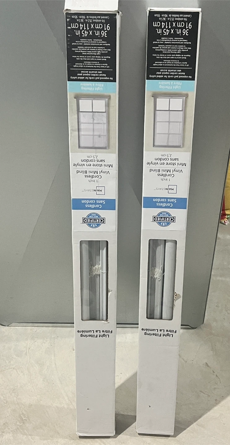 Two Mainstays 1 Inch cordless vinyl mini blinds included. Light filtering, light grey colour. Each blind measures 36 inches wide by 45 inches long. Wand control to open and close. No exposed pull cords for added safety. 15$ each one , take 2 25$
