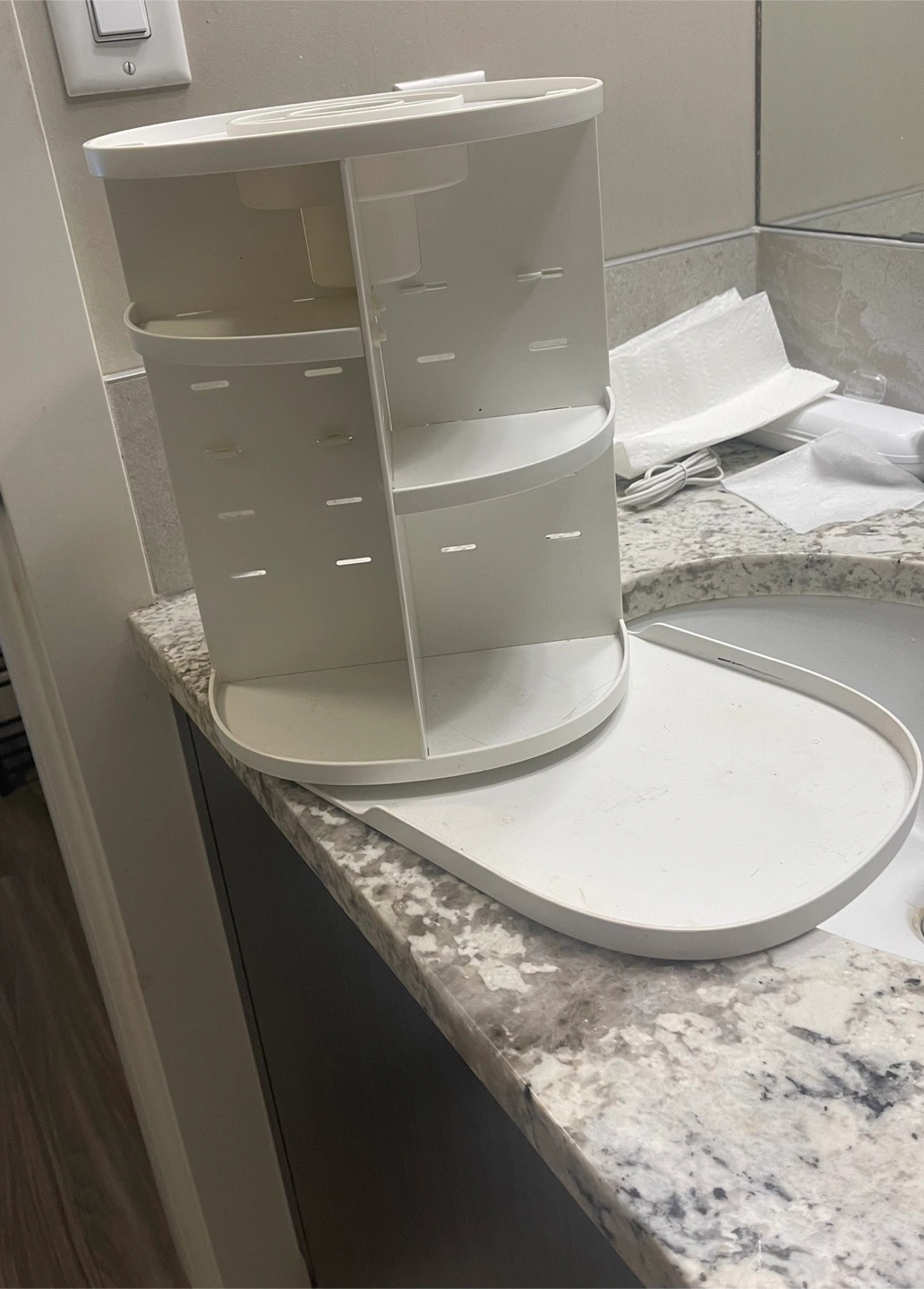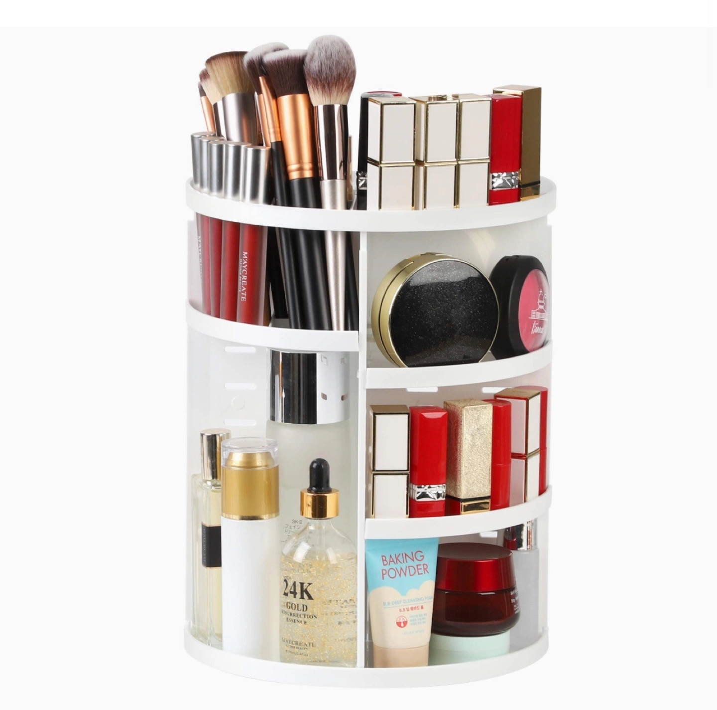 Declutter your space with this handy rotating makeup organizer! It's perfect for keeping all your cosmetics, brushes, and skincare products neatly arranged and easily accessible. It's white and in great shape!