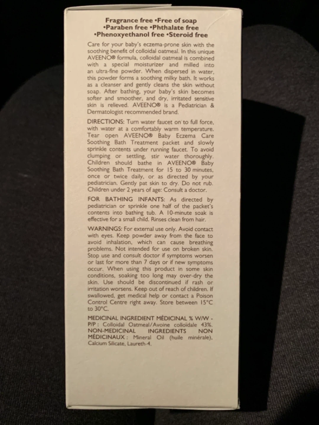 Aveeno Baby Eczema Care Soothing Bath Treatment with colloidal oatmeal. This is a fragrance-free, allergy-tested, and steroid-free formula to relieve dry, itchy, and irritated skin due to eczema, rashes, poison ivy/oak/sumac, and insect bites. Each box contains 5 x 21g single-use bath packets.