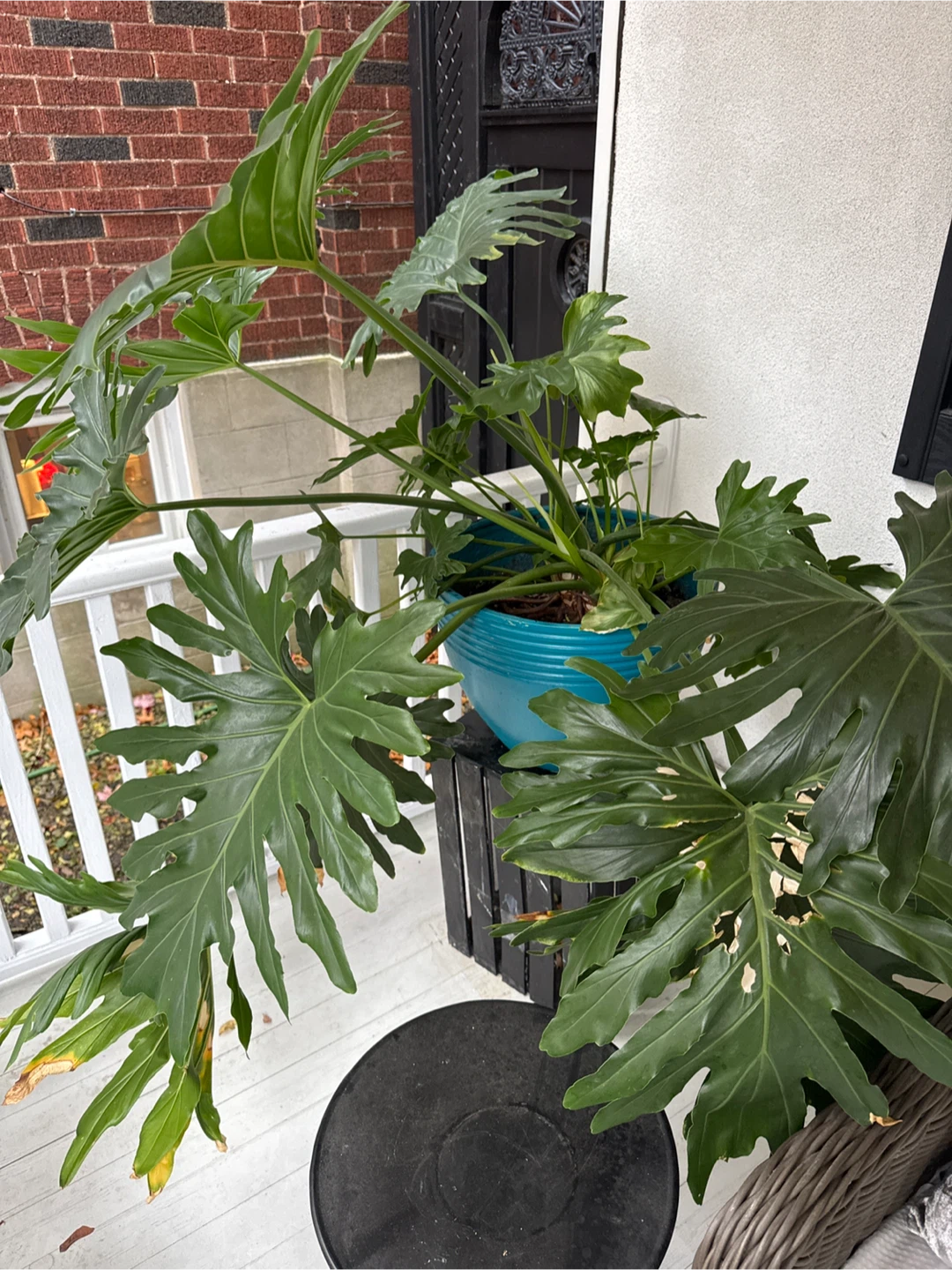 FREE! Philodendron Selloum plant! It's a great way to add some greenery to your home or balcony. It's in great condition but has been outside all summer and will need repotting and a wash for indoor use. In a large turquoise pot. Is heavy and too large to take on public transit.