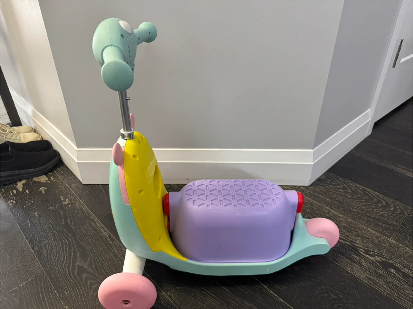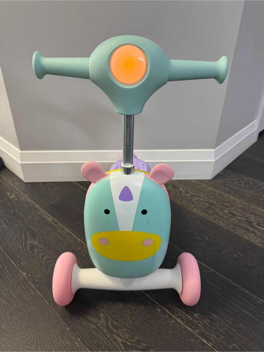 This cute Skip Hop Zoo scooter is designed like a unicorn. It's a 3-wheel ride-on that's perfect for little ones learning to scoot.