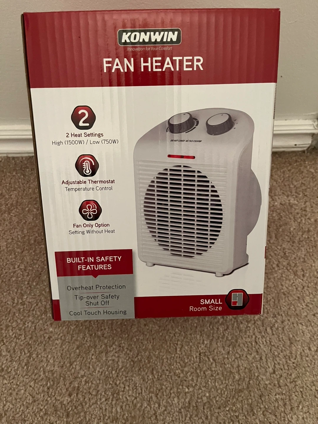Selling a Konwin fan heater, perfect for a small room! It has two heat settings: high (1500W) and low (750W). It also features an adjustable thermostat for temperature control and a fan-only option. Built-in safety features include overheat protection, tip-over safety shut off, and cool-touch housing