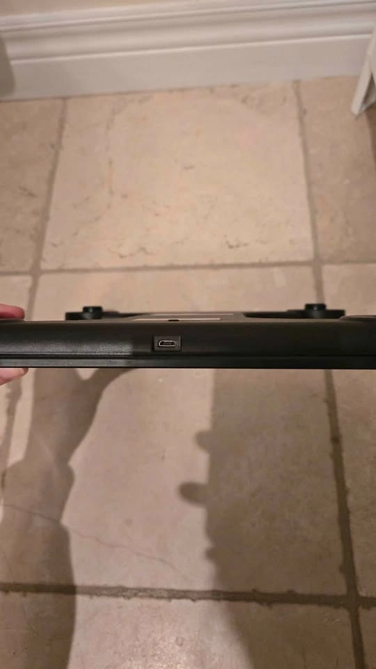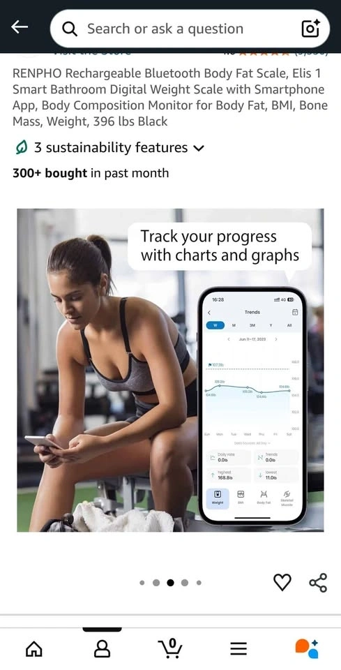 This smart bathroom scale tracks body fat, BMI, bone mass, and weight via a smartphone app. It's rechargeable and does not require batteries. Type A charger is required; the cable can be provided. Pick up at King and Shaw.