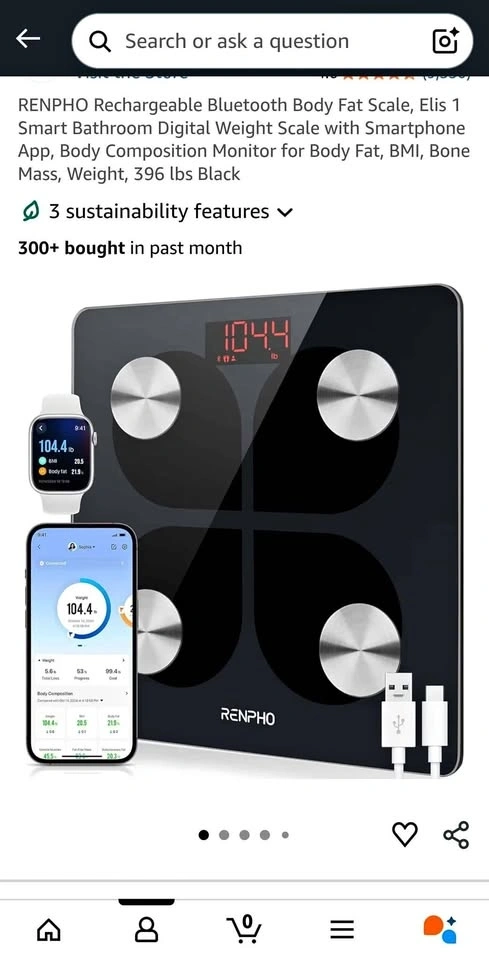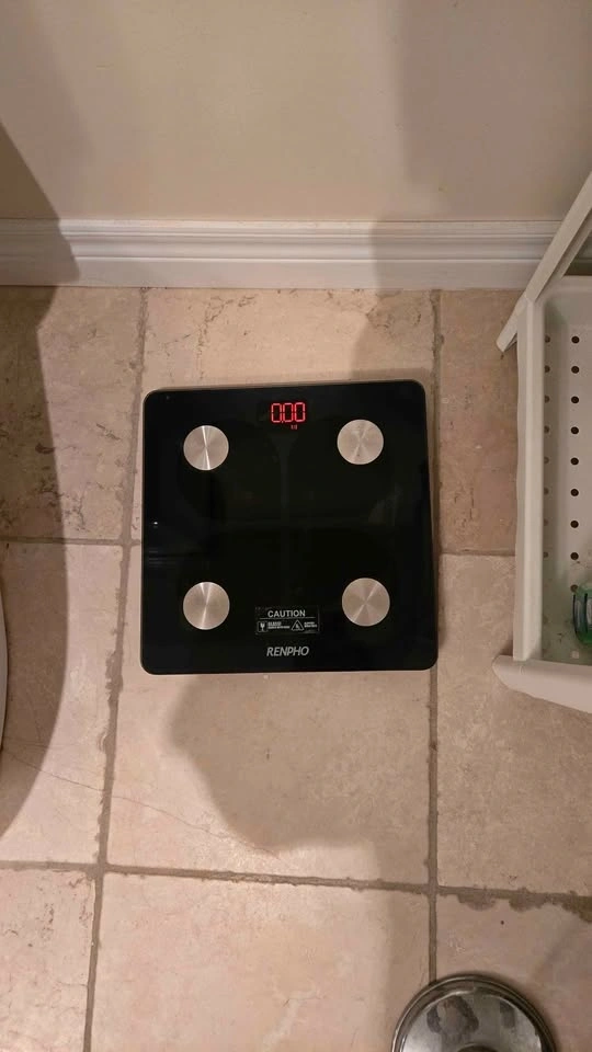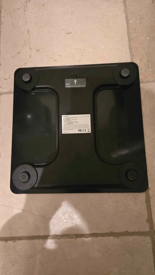 This smart bathroom scale tracks body fat, BMI, bone mass, and weight via a smartphone app. It's rechargeable and does not require batteries. Type A charger is required; the cable can be provided. Pick up at King and Shaw.