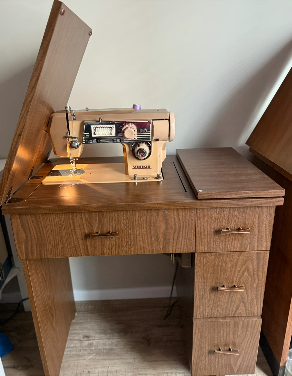 Selling a Viking sewing machine with its original cabinet. It's in good working condition and ready for its next home. Perfect for sewing enthusiasts! Pick up at Belmont sw Cash only