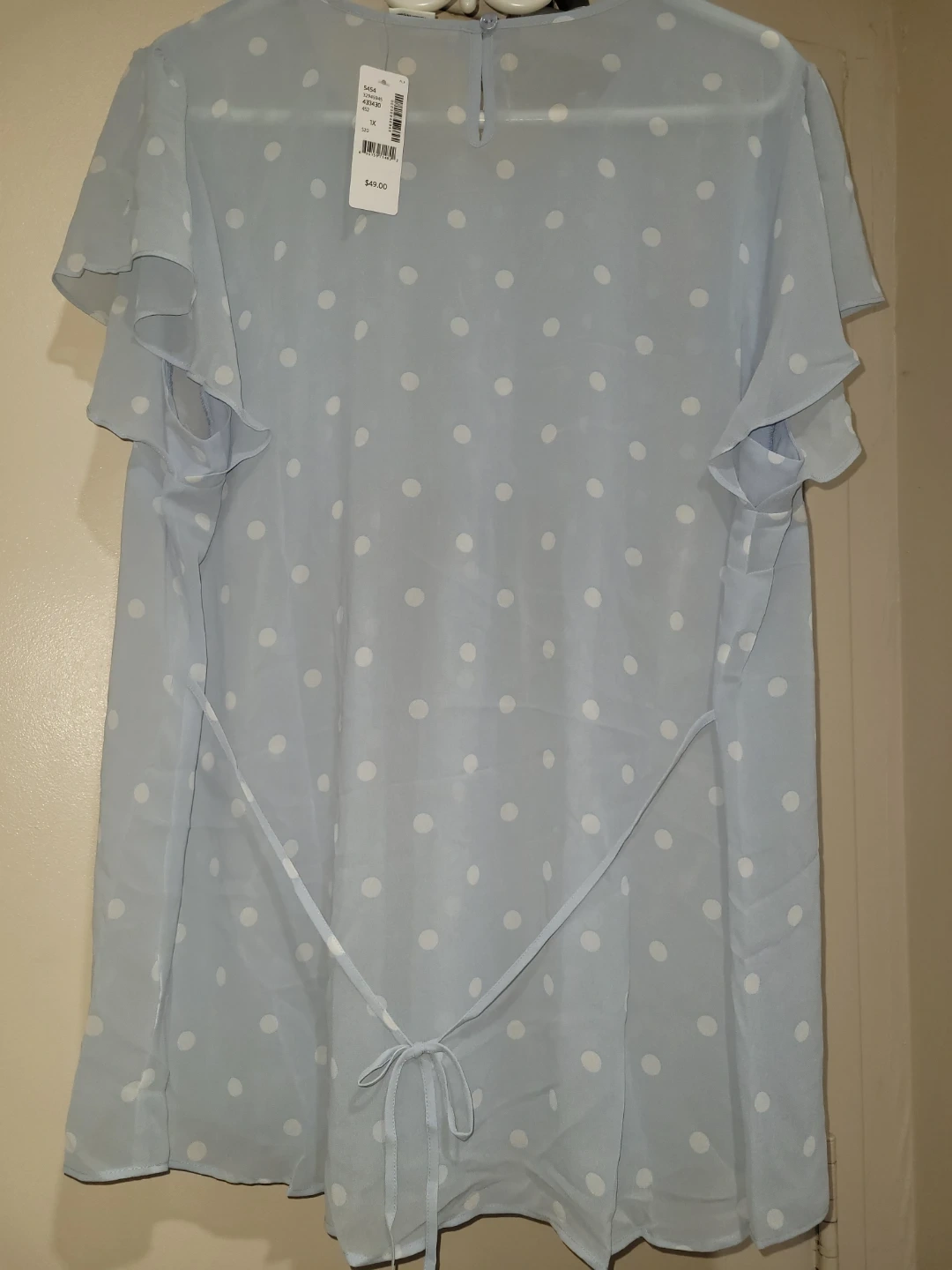 This light blue blouse features a classic polka dot pattern. It has short flutter sleeves and a tie-waist detail. The fabric is lightweight and flowy.
